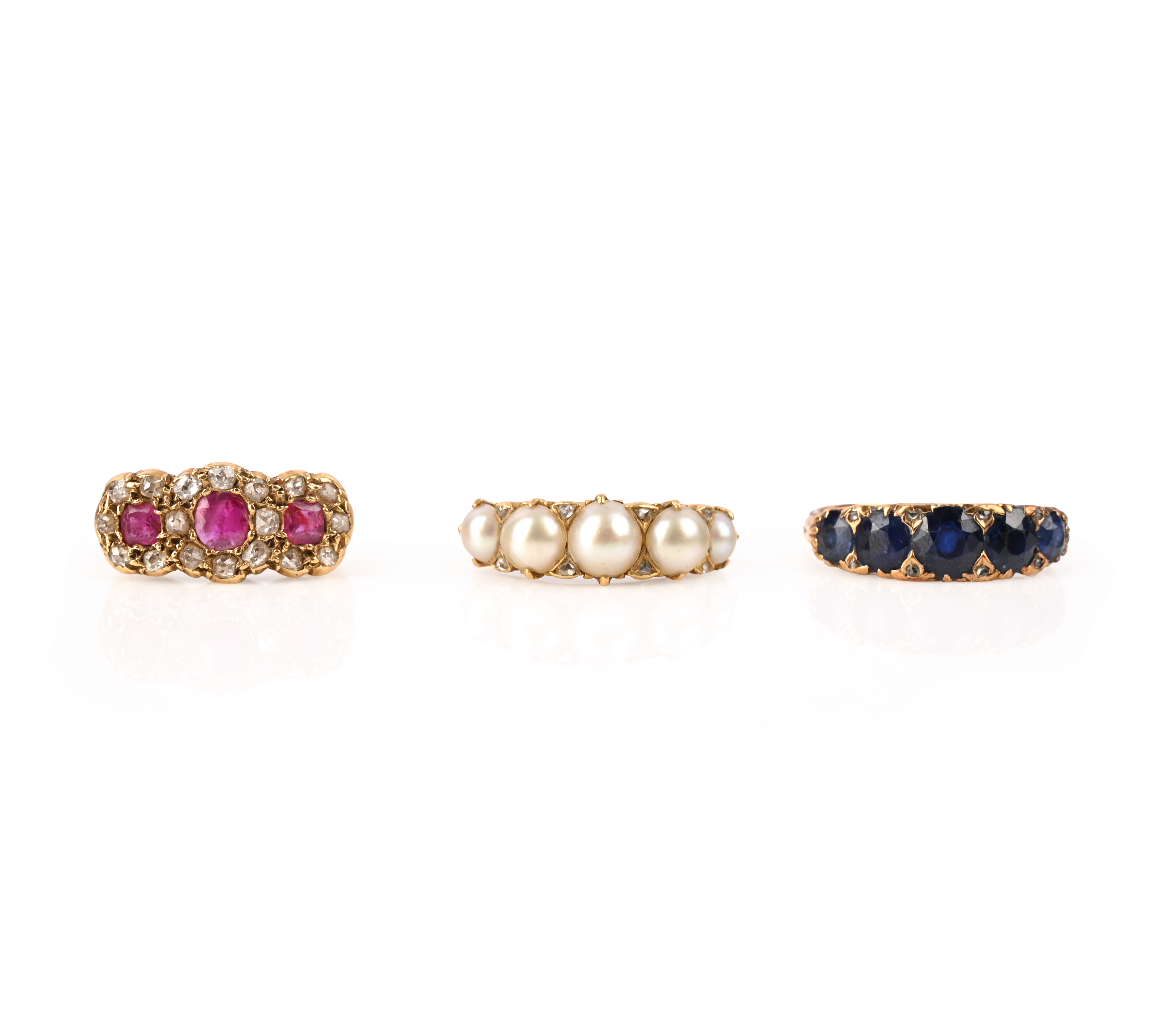 Three 19th century gold rings, comprising: an 18ct gold ring set with three graduated cushion-cut rubies within borders of smaller diamonds, London hallmarks, size J; a gold ring set with five graduated circular-sapphires in a carved mount accented with diamonds, size P; and a gold ring set with graduated half-pearls in a scrolling mount accented with diamonds, size N