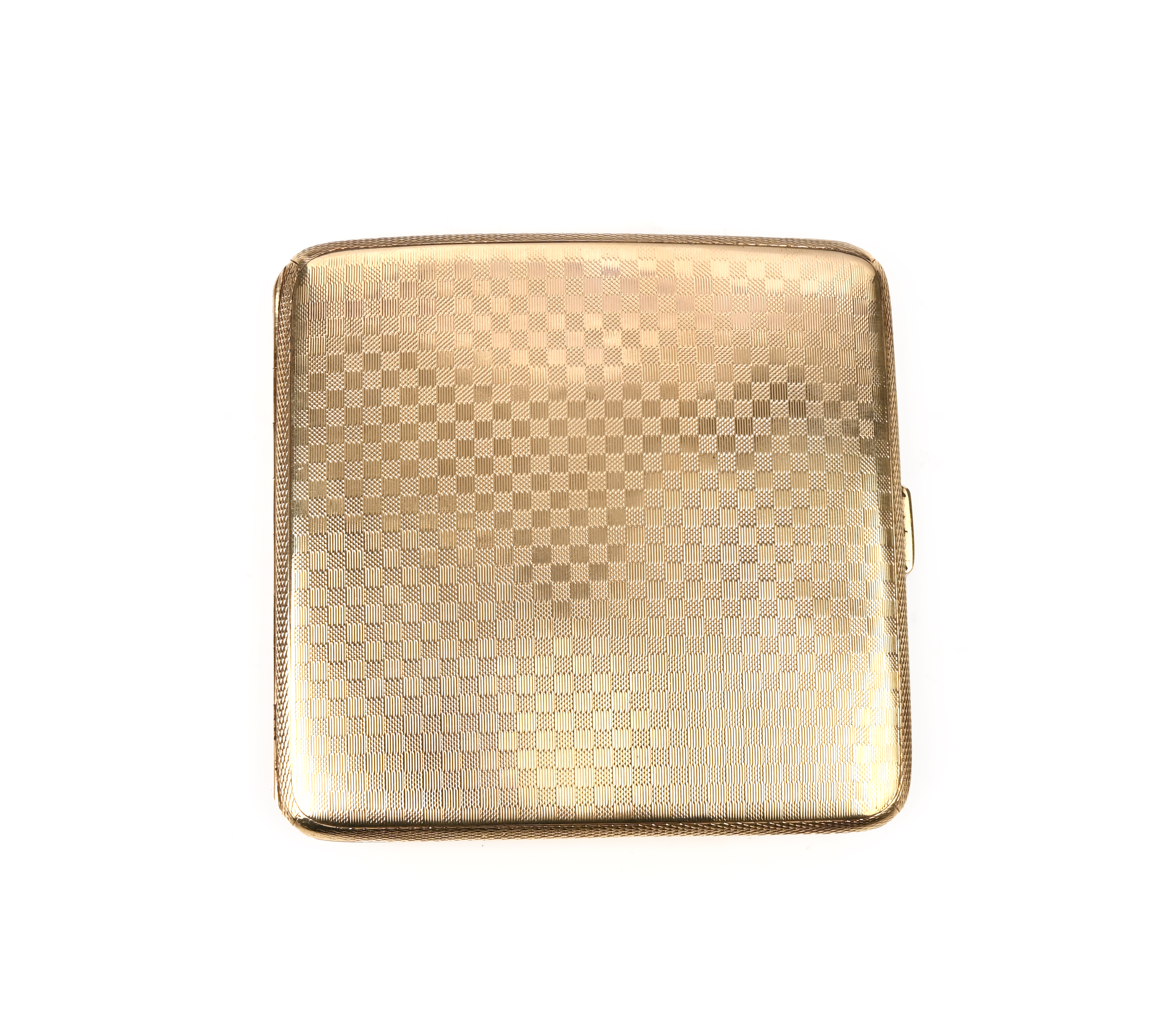 A gold cigarette case, 1928, of bowed form, the exterior with an engraved square chequer pattern, opening to reveal a plain interior, maker's mark P & B LD, London hallmarks for 9ct gold, date letter for 1928, measuring 8.5cm x 9cm x 0.7cm, 100g