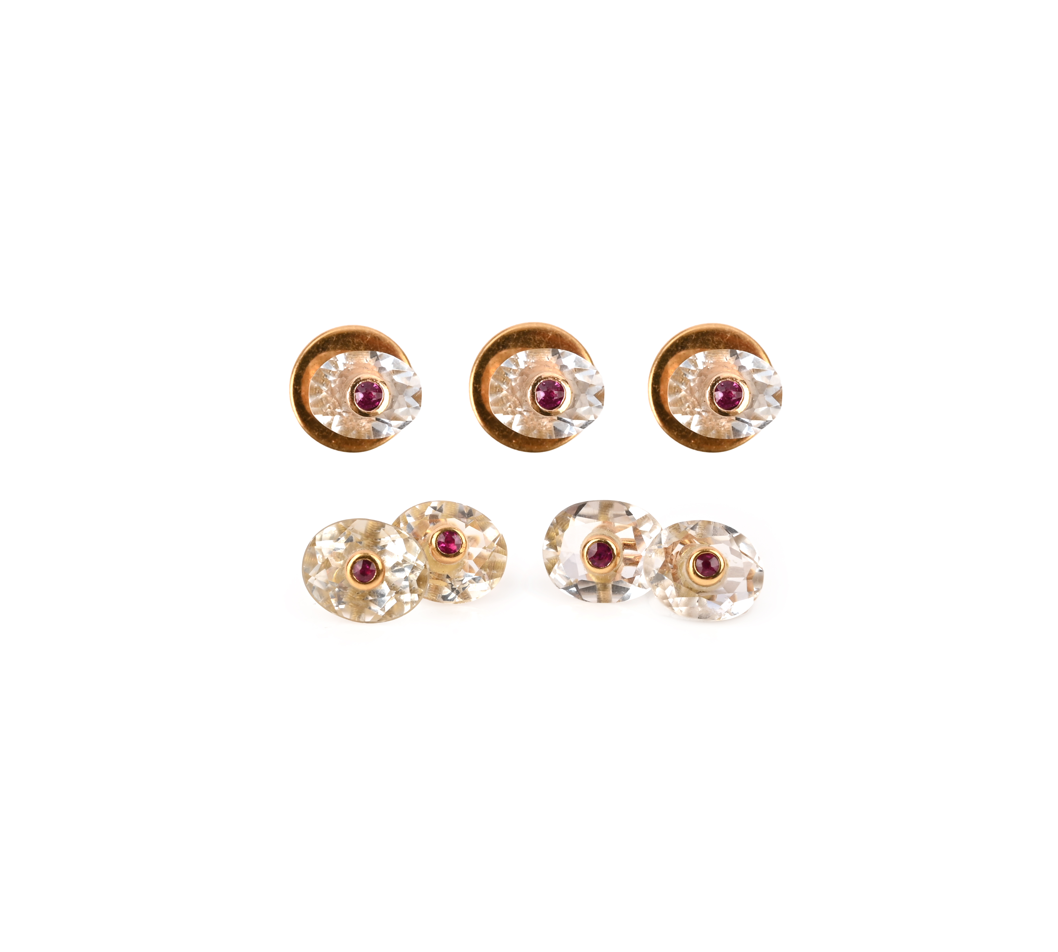 A French rock crystal and ruby dress set, comprising: three dress buttons and a pair of cufflinks, the terminals each composed of an oval faceted rock crystal centred with a collet-set circular-cut ruby, mounted in yellow gold, French control marks, maker's lozenge AD, terminal width 1.1cm