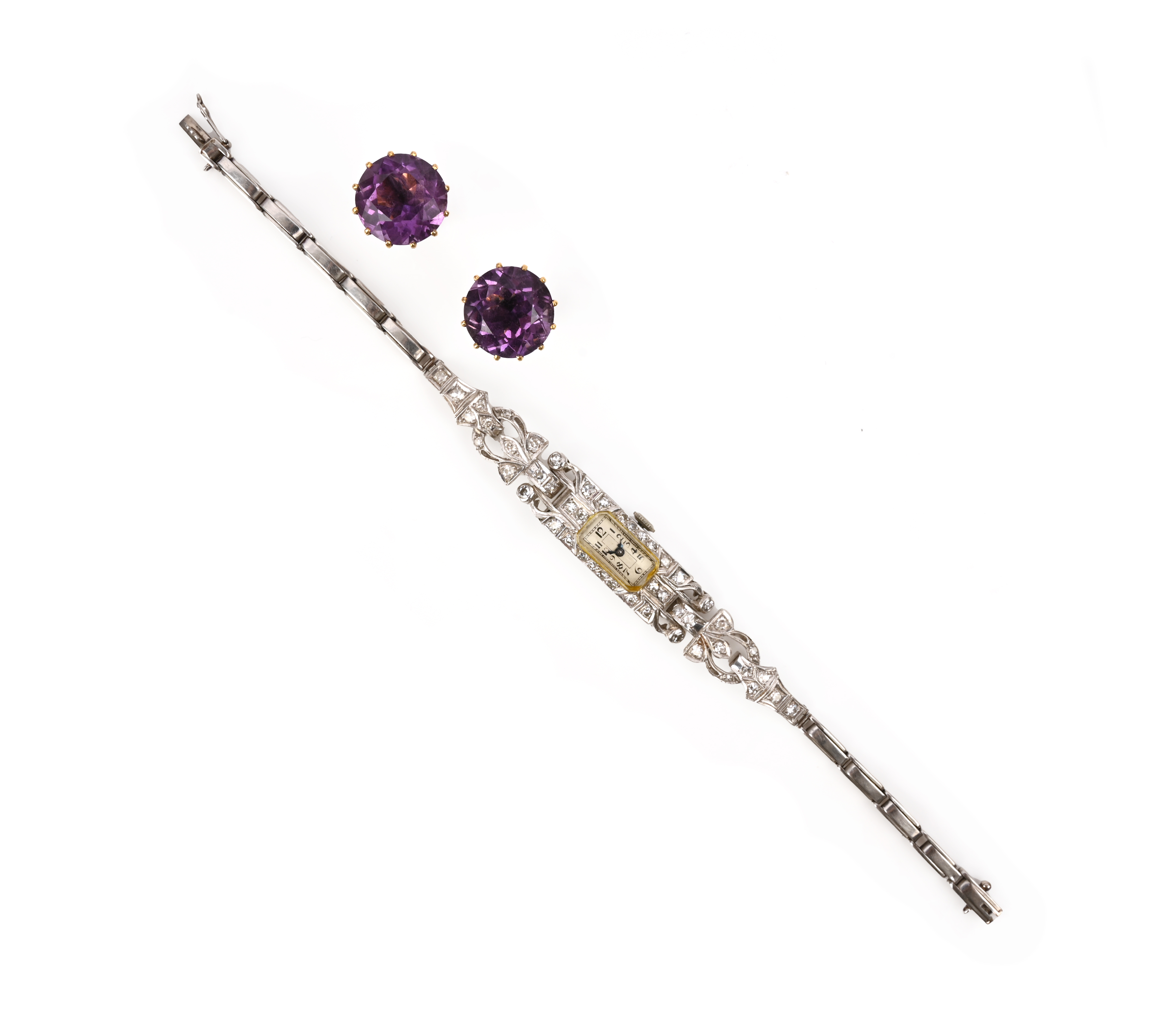 A pair of amethyst earrings and a diamond cocktail watch, comprising: a pair of stud earrings, the circular-cut amethysts claw set in yellow gold, post fittings, diameter 1.3cm, case; and a lady's diamond cocktail watch, the white rectangular dial with black Arabic numerals and blued steel hands, within a case of geometric design millegrain-set with single-cut diamonds, mounted in platinum, manual winding, case width 1cm, strap length 17.3cm, face re-glued