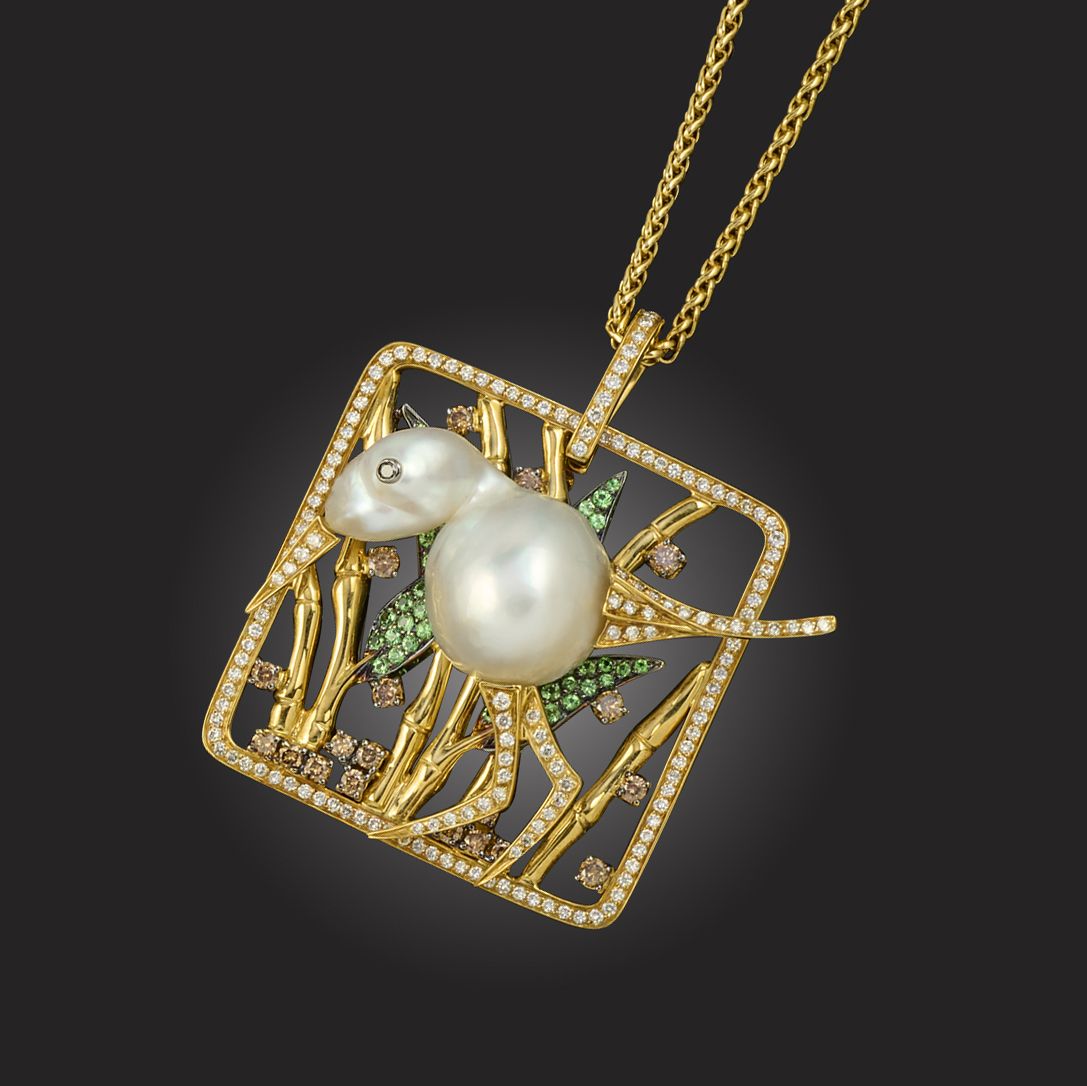 A diamond and cultured pearl pendant, centring on a baroque pearl forming the body of an aquatic bird with diamond-set beak, legs and tail and a black diamond eye, to a square openwork frame with an bamboo motif set with brown and white round brilliant-cut diamonds and green garnets, in yellow gold, to a fine link chain, pendant and chain stamped 750, pendant length 4.8cm, chain length 44.5cm