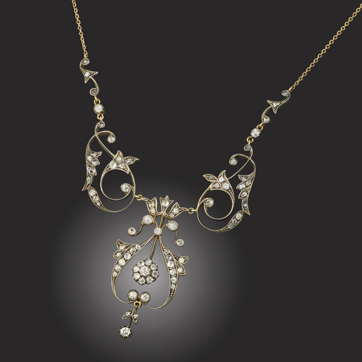 A Belle Epoque diamond necklace, circa 1900, composed of symmetrical foliate scrolls set with old cushion-shaped diamonds and rose-cut diamonds mounted in silver and gold, to a fine link gold chain, chain length 37cm, case