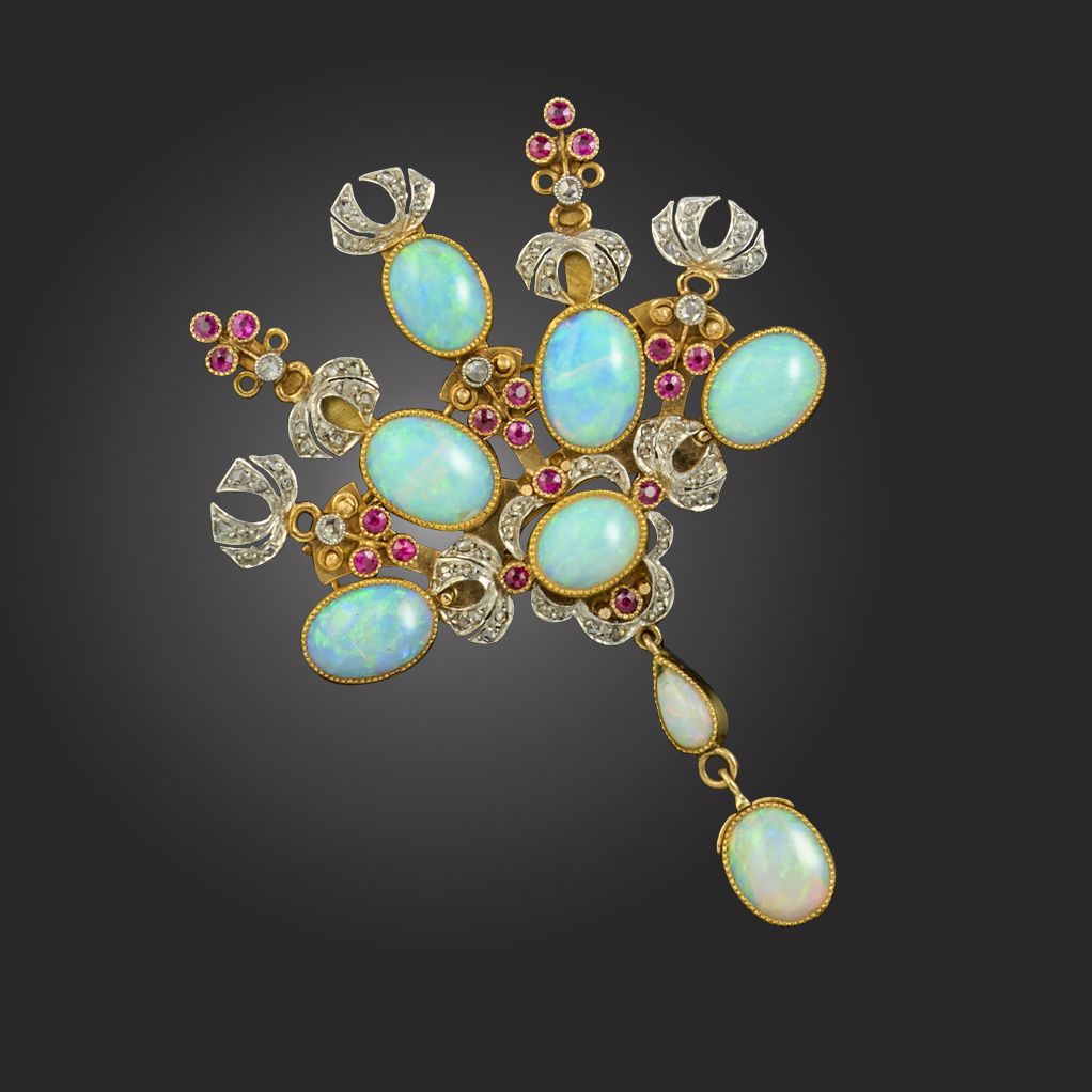 An opal and diamond spray brooch, converted, set with cabochon white opals within ruby and diamond accents and suspending a further opal drop in yellow gold, length 7cm