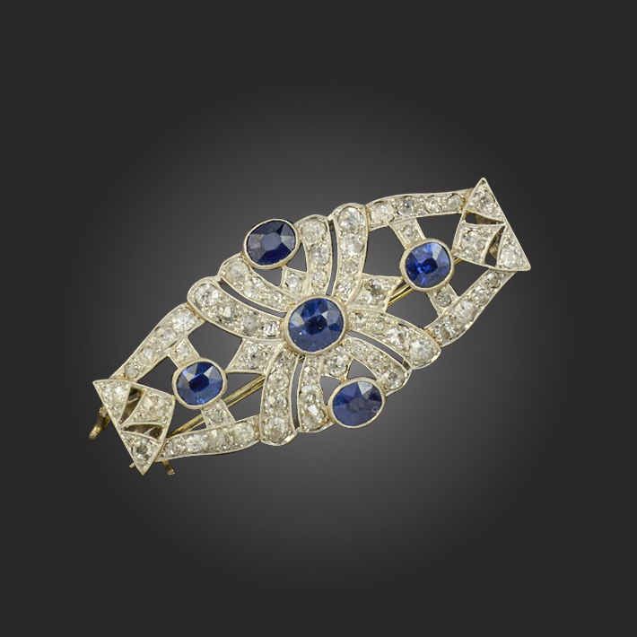 An early 20th century sapphire and diamond brooch, the lozenge-shaped brooch set with five graduated oval-shaped sapphires millegrain-set within openwork diamond surround on platinum, length 4cm, case