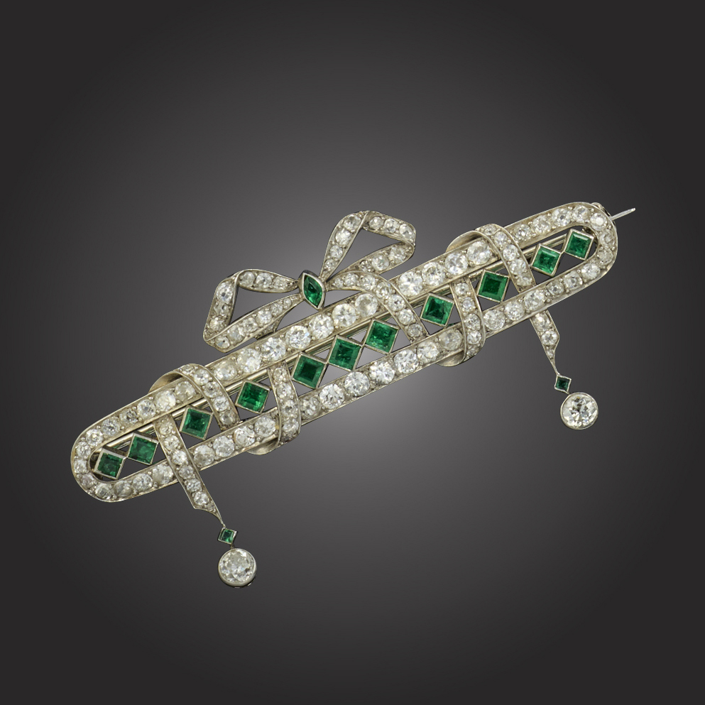 An early 20th century emerald and diamond brooch, designed as a stylised bow and trailing ribbon around a horizontal lozenge set with a central line of square emeralds within a border of old circular-cut diamonds in platinum, width 6.7cm
