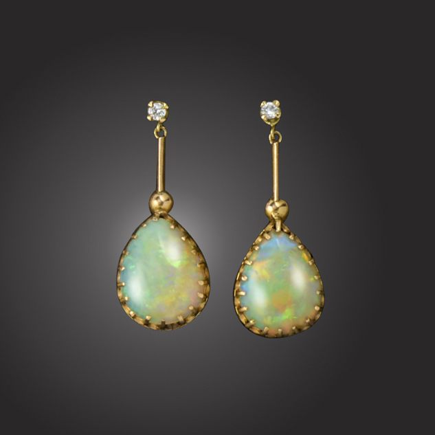 A pair of opal and diamond drop earrings, the pear-shaped opal cabochons suspended from knife-edge links and a small diamond in gold, length 2.7cm