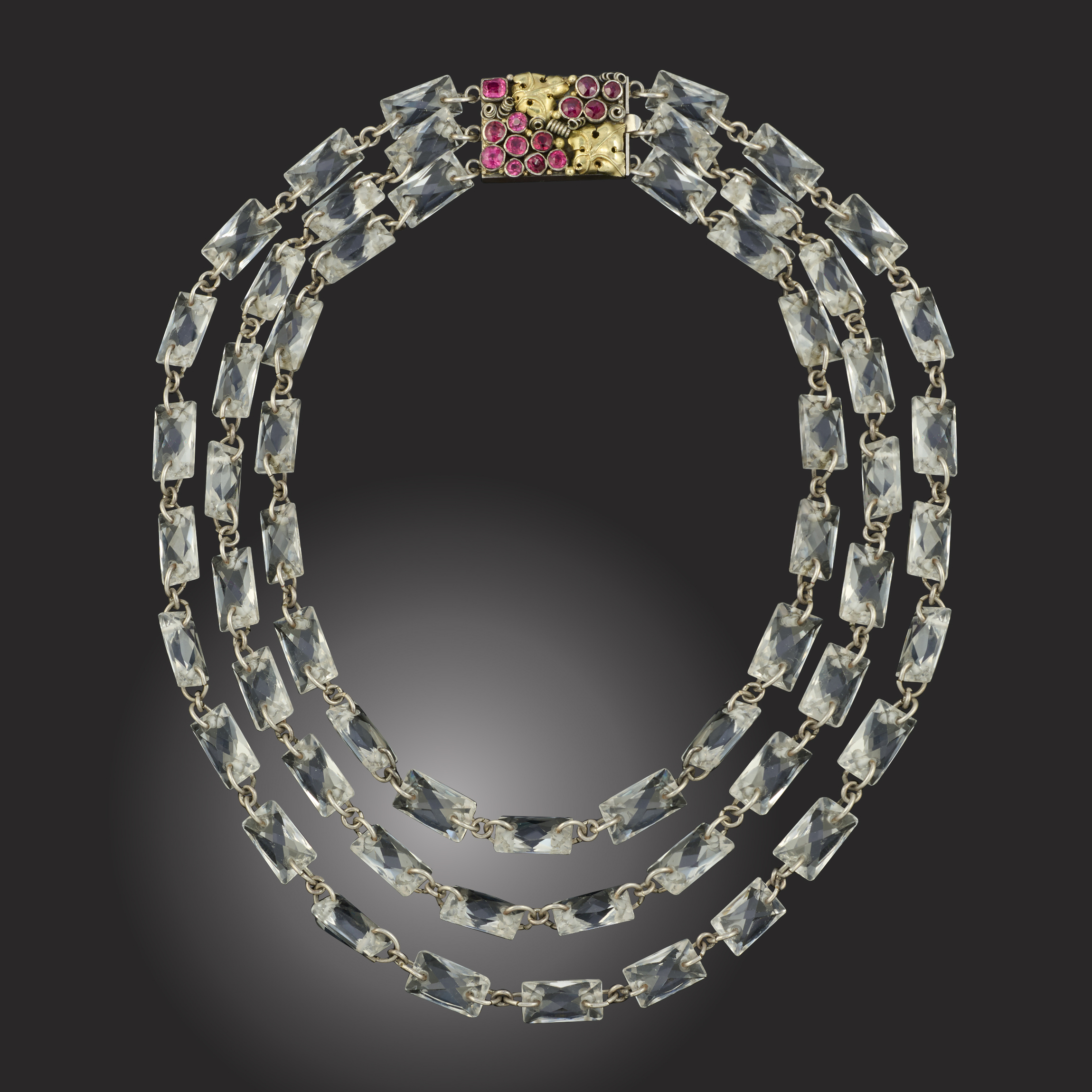 An Arts and Crafts gem-set necklace attributed to Dorrie Nossiter, with three rows of faceted rock crystal, the clasp set with stylised vine leaves in gold, amongst spinels and rubies in silver setting, unsigned, length 50cm longest