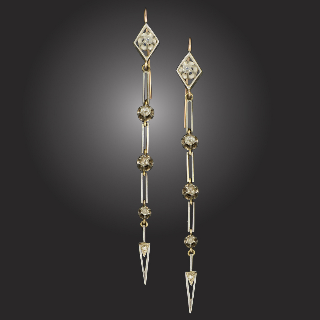 A pair of diamond drop earrings, set with old cushion-shaped diamonds within lozenge-shaped links suspending articulated links alternately-set with diamonds in silver and gold, shepherds hook fittings, length 7.9cm
