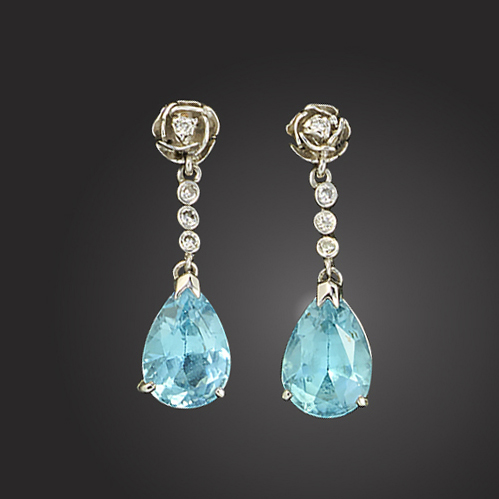 A pair of aquamarine and diamond drop earrings, the pear-shaped aquamarines suspended from three small diamonds in rub-over settings and topped with a stylised rose, set with a central diamond in white gold, post and butterfly fittings, length 2.6cm