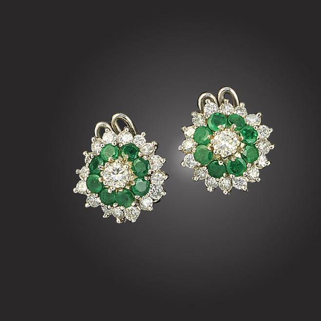 A pair of emerald and diamond cluster earrings, each with a round brilliant-cut diamond within wavy concentric borders of circular-cut emeralds and round brilliant-cut diamonds, mounted in white gold, width 1.5cm, case