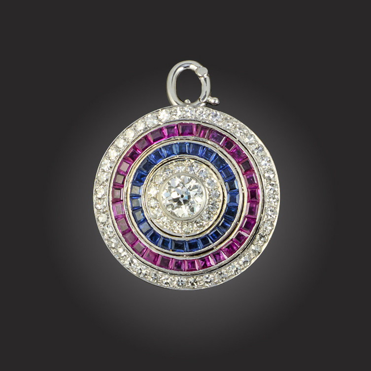 A sapphire, ruby and diamond target brooch pendant