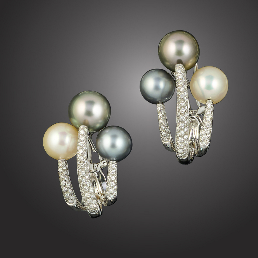 A pair of cultured pearl and diamond earrings, each set with three multi-coloured cultured pearls measuring 10-11.5mm above stylised settings pavé-set with round brilliant-cut diamonds in white gold, stamped 750, clip and post fittings, length 3.5cm