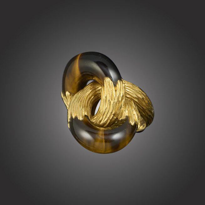 Kutchinsky, a tiger's eye and 18ct gold ring, circa 1971, designed as two interlocking hoops of tiger's eye to a tapering textured 18ct gold shank, signed Kutchinsky, London hallmarks, date letter for 1971, size I 1/2, gross weight 18g