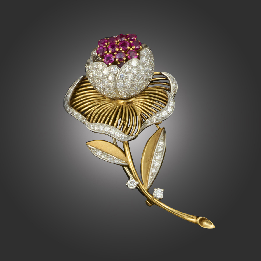 A ruby and diamond flower brooch, mid 20th century, set with graduated rubies and diamonds within pierced yellow gold petals accented with diamonds on gold and diamond-set stem, length 6.2cm