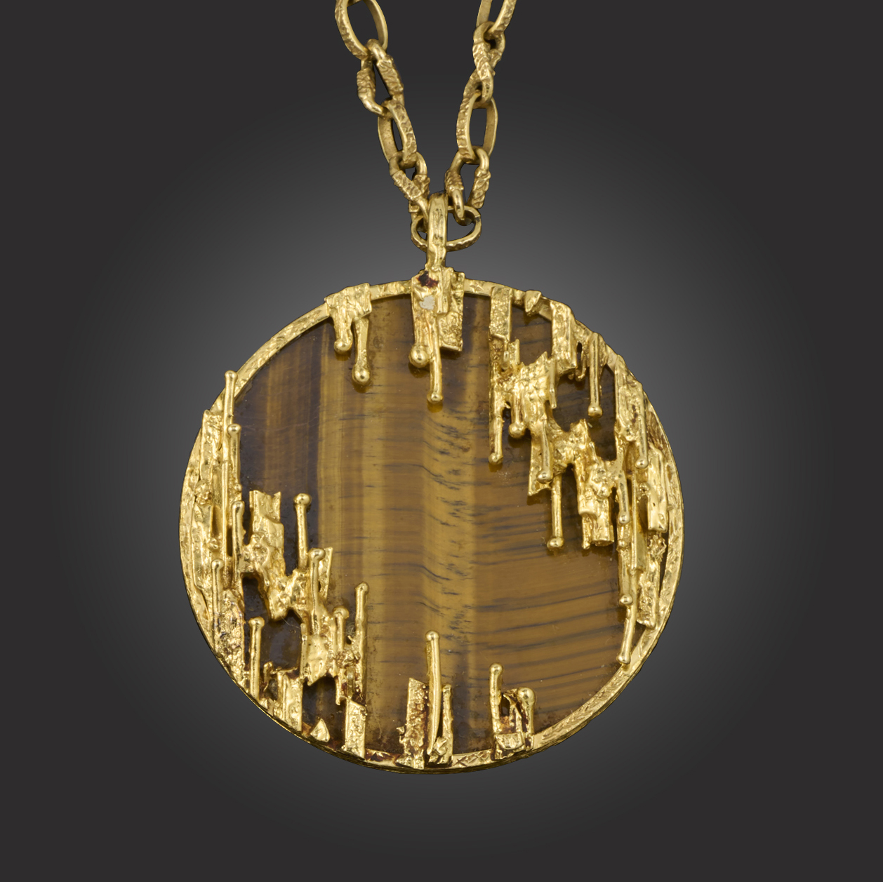 Kutchinsky, a tiger's eye and 18ct gold pendant necklace, circa 1971, the pendant designed as a large circular tiger's eye plaque within a textured gold mount, to a chain of textured gold linking, pendant,maker's mark and with London hallmarks, date letter for 1971, chain stamped 750, pendant width 5.8cm, chain length 72cm, gross weight 97g