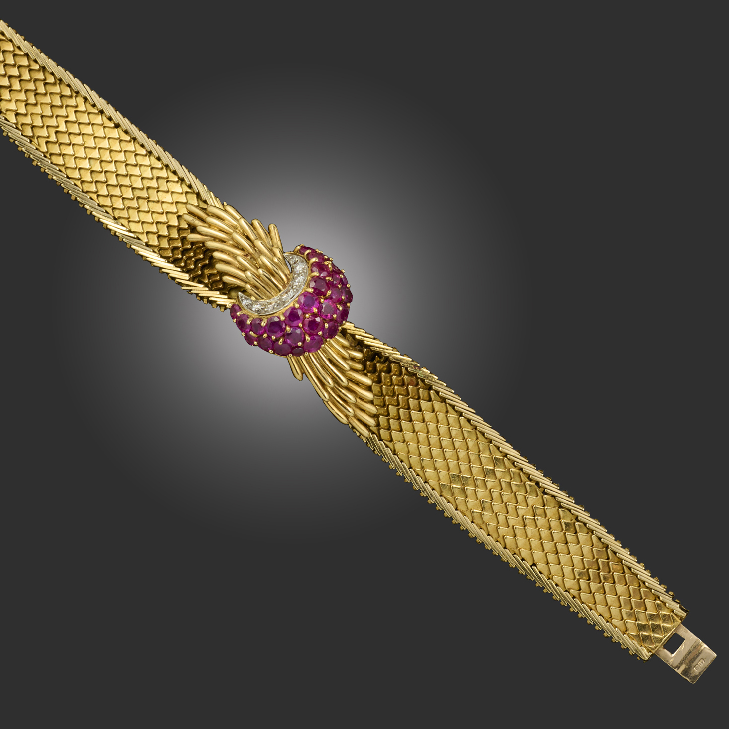 Jaeger-LeCoultre for Kutchinsky, a lady's ruby, diamond and 18ct gold wristwatch, circa 1973, the concealed circular dial with gilt Arabic numerals at 12, 3, 6 and 9 o'clock and gilt hands, the cover pavé-set with a crescent of circular-cut rubies and round brilliant-cut diamonds, centring a wirework spray and an integral mesh strap, manual winding, dial signed Jaeger-LeCoultre, strap with maker's mark for Kutchinsky, London hallmarks, date letter for 1973, case width 1.5cm, strap length 16cm, gross weight 55g