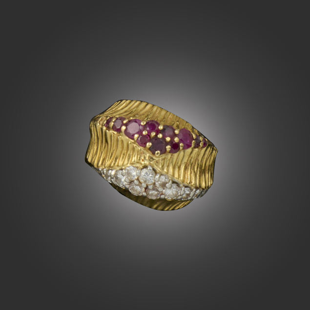 Kutchinsky, a ruby and diamond bombé ring, of abstract design, pavé-set with circular-cut rubies and round brilliant-cut diamonds in a high textured surround, in yellow gold, rubbed signature for Kutchinsky, size H 1/2, 12g