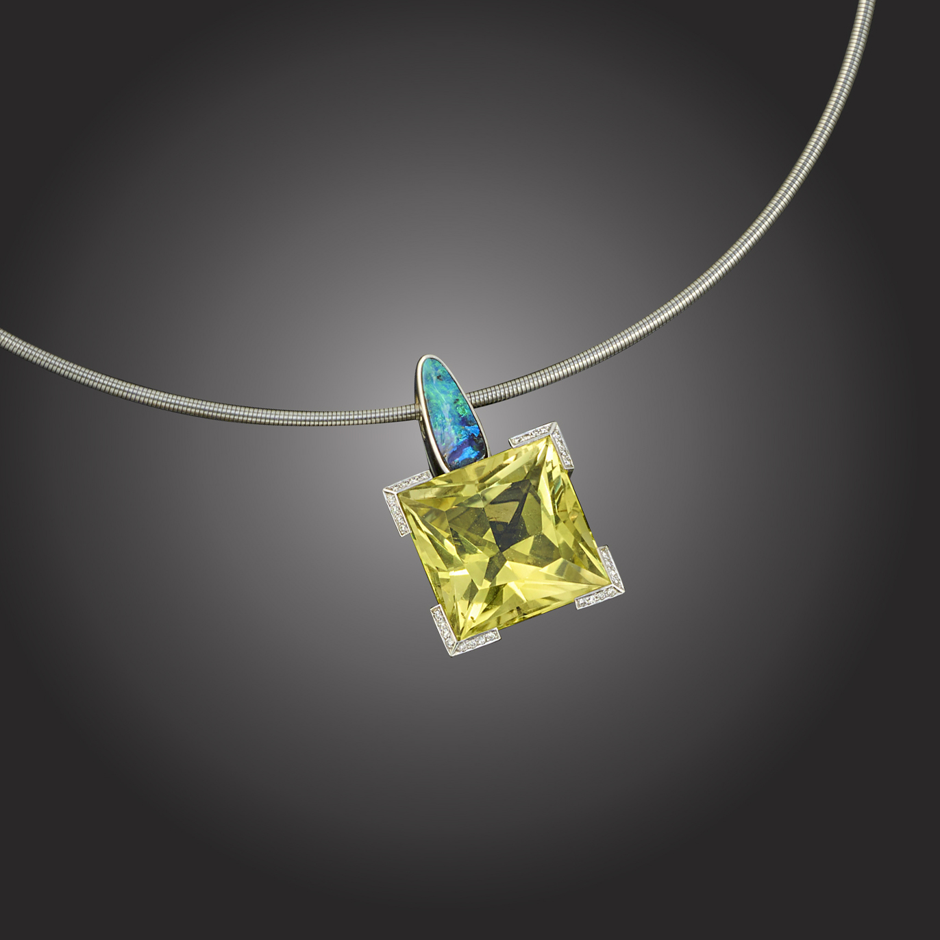 A green quartz and opal pendant, the square green quartz within diamond-set corners in white gold setting, suspending from an opal, stamped 750 with makers mark MS possibly for Manfred Seitner, on a silver snake-link necklace, pendant length 3.6cm, necklace length 40cm approx