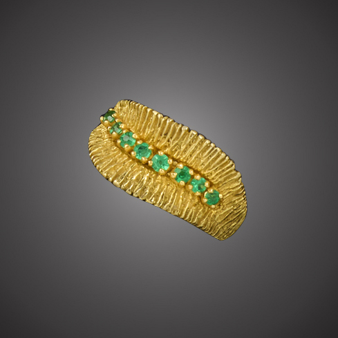 An emerald-set gold ring, set with a central line of circular-cut emeralds within textured fanned border in 18ct yellow gold, maker's mark SMCo and London import marks for 1980, size L 1/2