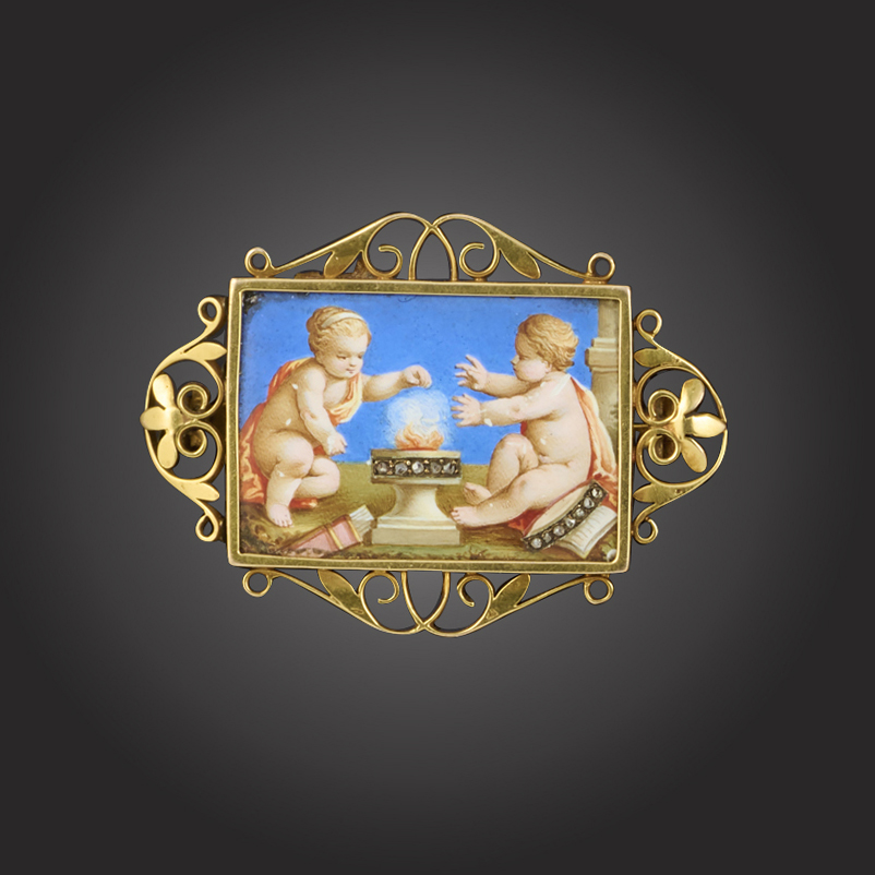 An enamel and diamond brooch, 19th century, the enamel plaque with an allegorical depiction of Winter with two putti warming themselves at a hearth, the scene detailed with rose-cut diamonds, in a yellow gold mount with openwork foliate scroll borders, enamel chipped, width 4.4cm