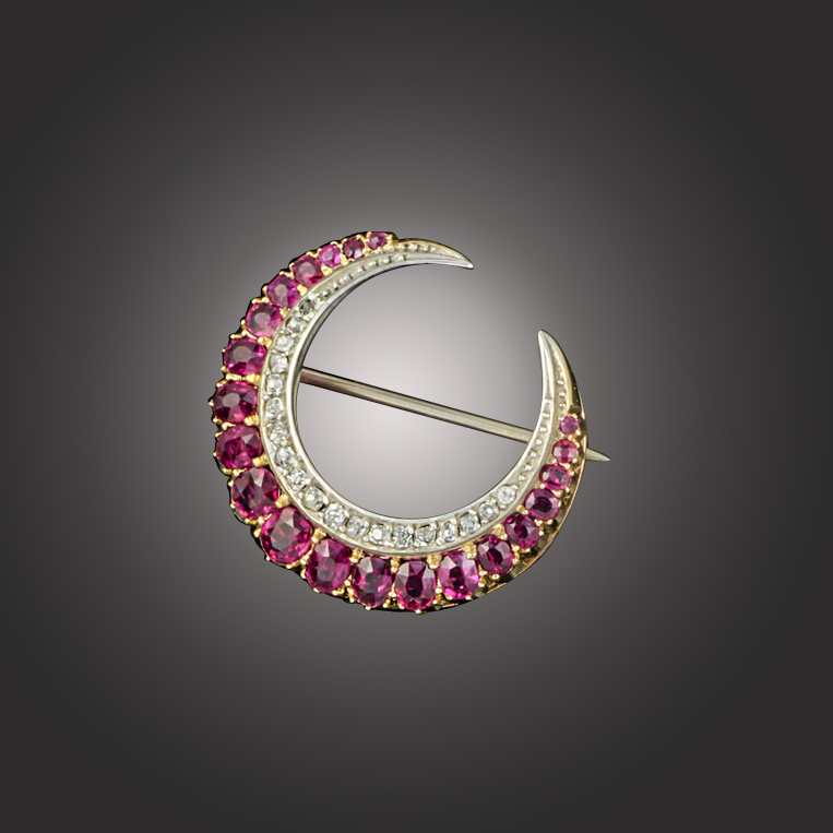 A ruby and diamond closed crescent brooch, set in gold with an outer row of graduated oval shaped rubies and an inner row of graduated old mine-cut diamonds, width 2.9cm