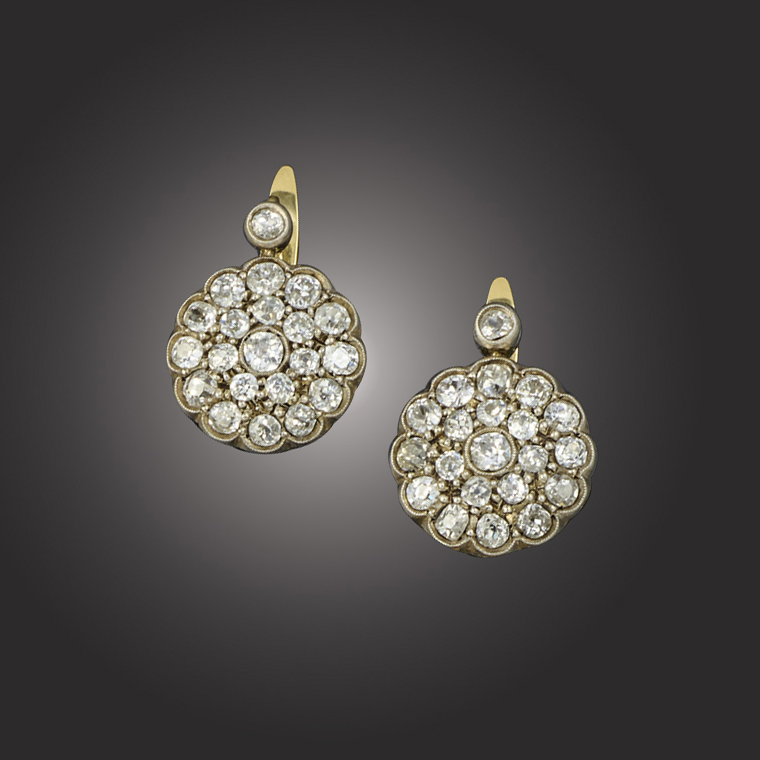 A pair of diamond cluster earrings, each diamond cluster suspending beneath another circular-cut diamond in silver and gold settings, post and clip fittings, length 2.1cm, case
