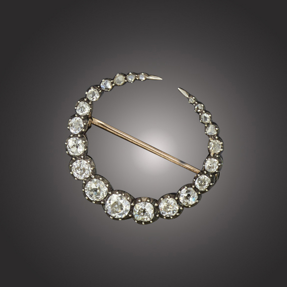 A Victorian diamond brooch, late 19th century, designed as a crescent, set with graduated old cushion-cut diamonds, mounted in silver and gold, width 2.5cm, case
