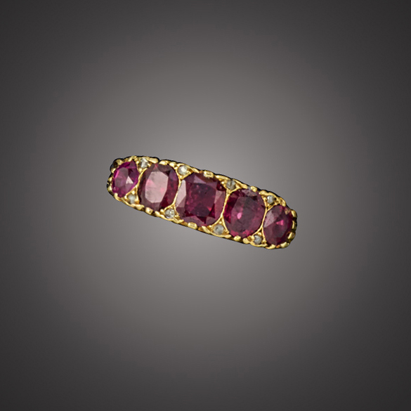 A ruby five-stone ring, the graduated cushion-shaped rubies with diamond pointers in carved and pierced yellow gold setting, French import mark, size N 1/2