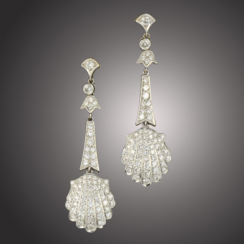A pair of diamond drop earrings, of pendant design with shell-shaped terminals, mounted with round brilliant-cut diamonds millegrain-set in white gold, Swiss control marks, stamped 750, length 4.5cm, case