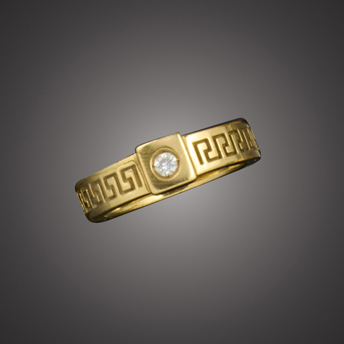 Versace, a diamond solitaire ring, the round brilliant-cut diamond set in 18ct yellow gold, flanked by an engraved 'Greek Key' design, stamped VERSACE, stamped 750, with Italian control marks, size M
