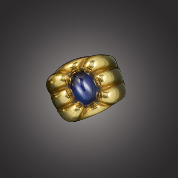 Birks, a sapphire dress ring, set with a sugarloaf sapphire within fluted yellow gold setting, signed Birks and stamped 18k, size H approx