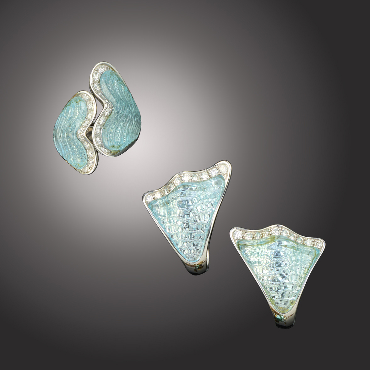 Scavia, a blue topaz and diamond demi-parure, comprising: a ring with tapering terminals set with carved blue topaz of aquatic design with terminals of round brilliant-cut diamonds, in white gold, signed Scavia, Italian control marks, stamped 750, size L; and a pair of earrings of similar design, each set with a carved blue topaz below a border of round brilliant cut diamonds, in white gold, signed Scavia, Italian control marks, stamped 750, clip and post fittings, length 2.8cm