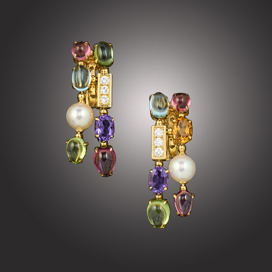 Bulgari, a pair of 'Allegra' multi-gem drop earrings, set with diamonds, topaz, green and pink tourmalines, cultured pearls and sapphires, set in 18ct gold, stamped BULGARI, Made in Italy, 750, clip fittings, length 3.5cm