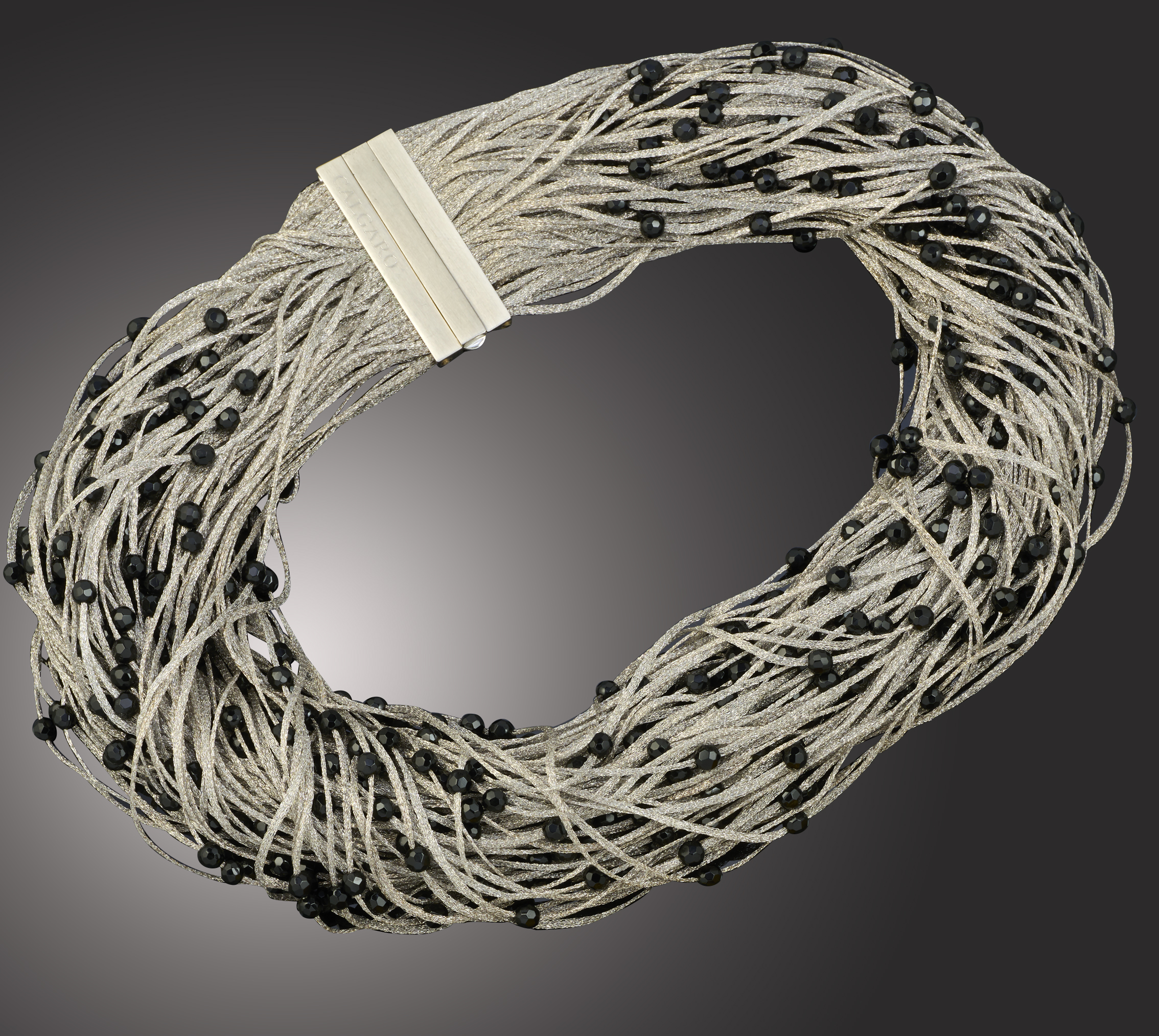 Calgaro, a gold and onyx 'Rugiada' collar necklace and similar pair of amethyst earrings, the necklace composed of white gold mesh strands strung with faceted onyx beads, signed Calgaro, stamped 750, length 43.5cm, gross weight 95g; and a pair of earrings each composed of six graduated white gold mesh strands strung with faceted amethyst beads, stamped 750, post fittings, length 5.5cm, gross weight 7g