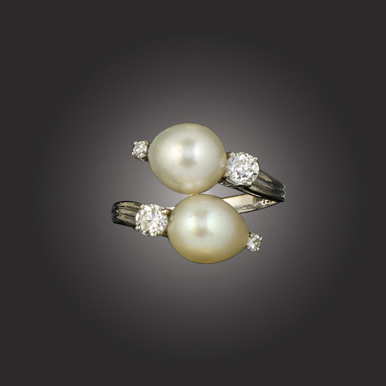 Gübelin, a natural pearl and diamond crossover ring, set with two pearls each within a larger and smaller circular-cut diamond on fluted white gold shank, stamped 750, with maker's mark, size O