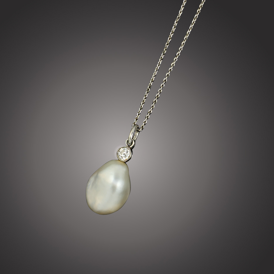 A natural pearl and diamond pendant, the old circular-cut diamond rubover-set in platinum and suspending a drop-shaped pearl measuring 16.05 x 12.11 x 8.84mm, on fine-link platinum neck chain, chain length 48cm, case