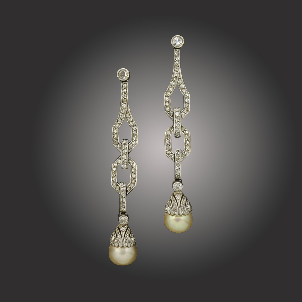 A pair of early 20th century natural pearl and diamond drop earrings, of geometric design set with small old cushion-shaped diamonds in articulated platinum mounts, each suspending a natural pearl, length 5.2cm, post fittings