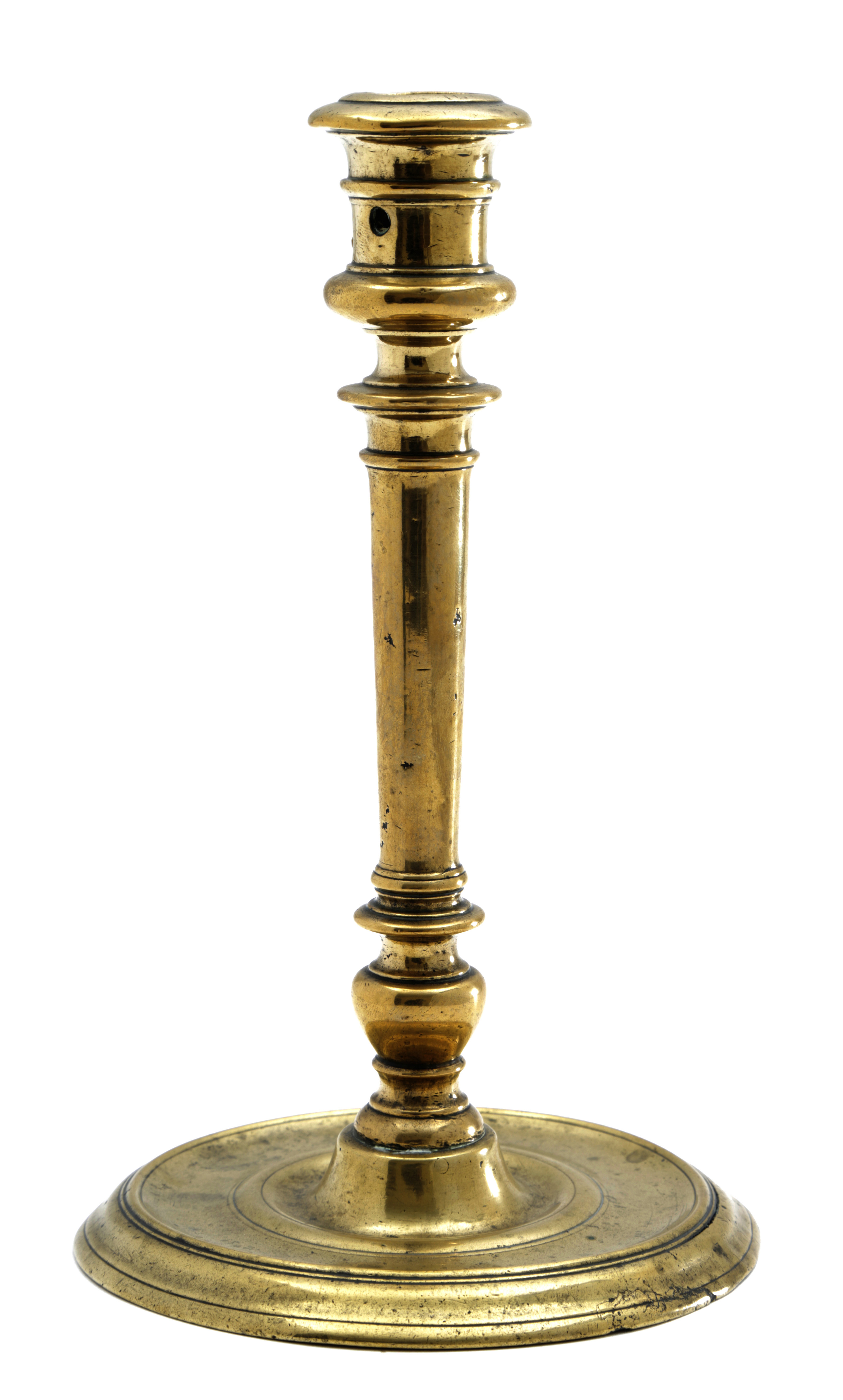 the single fillet socket with an iron core pin and single circular extraction hole, on a tapering stem with basal knop, on a dished and spreading circular base