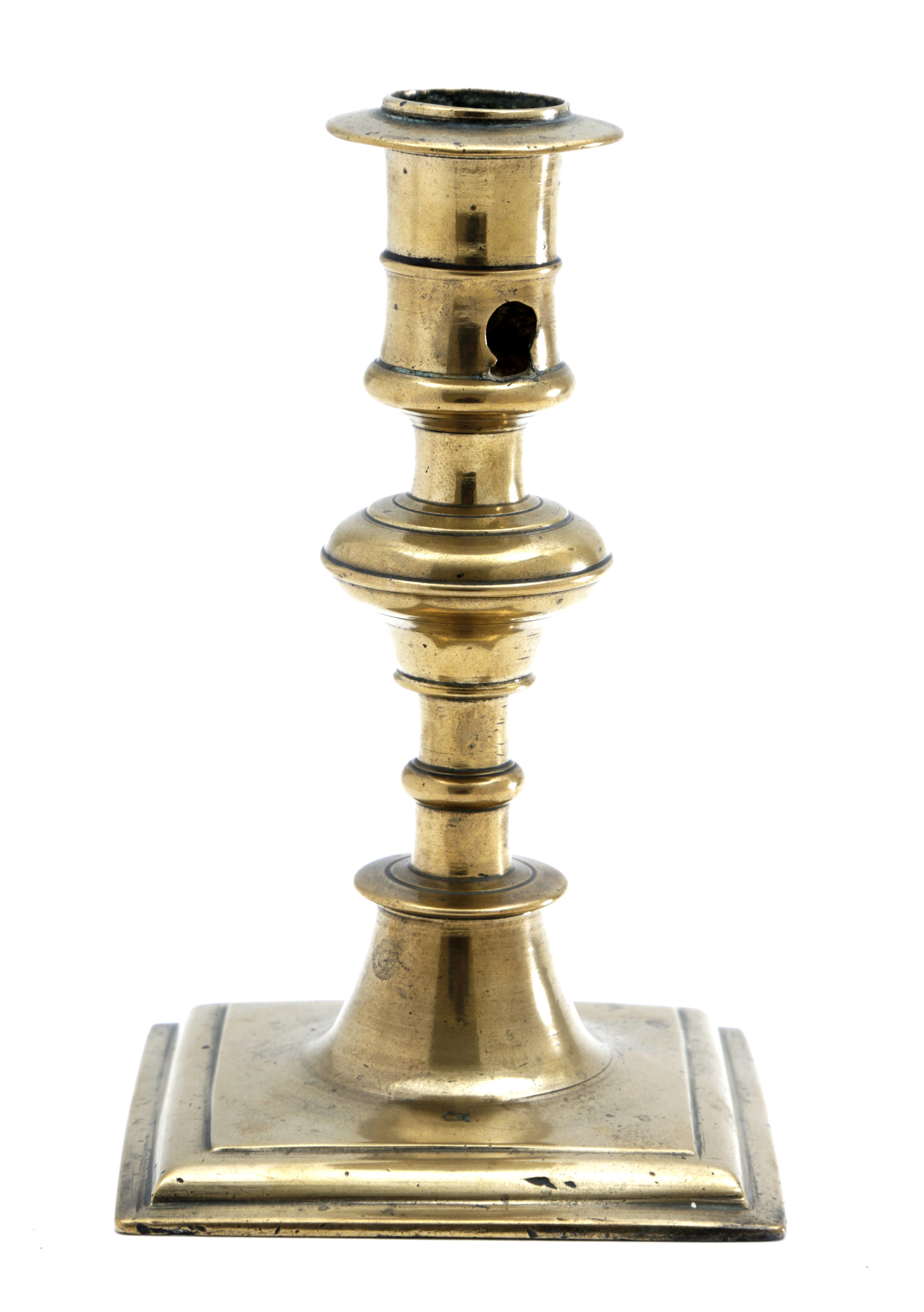 the bold cylindrical socket with mid-fillet and circular extraction aperture, the stem with an inverted acorn knop, spreading foot and stepped, flat square base with two punches of a crowned 'R' duty mark