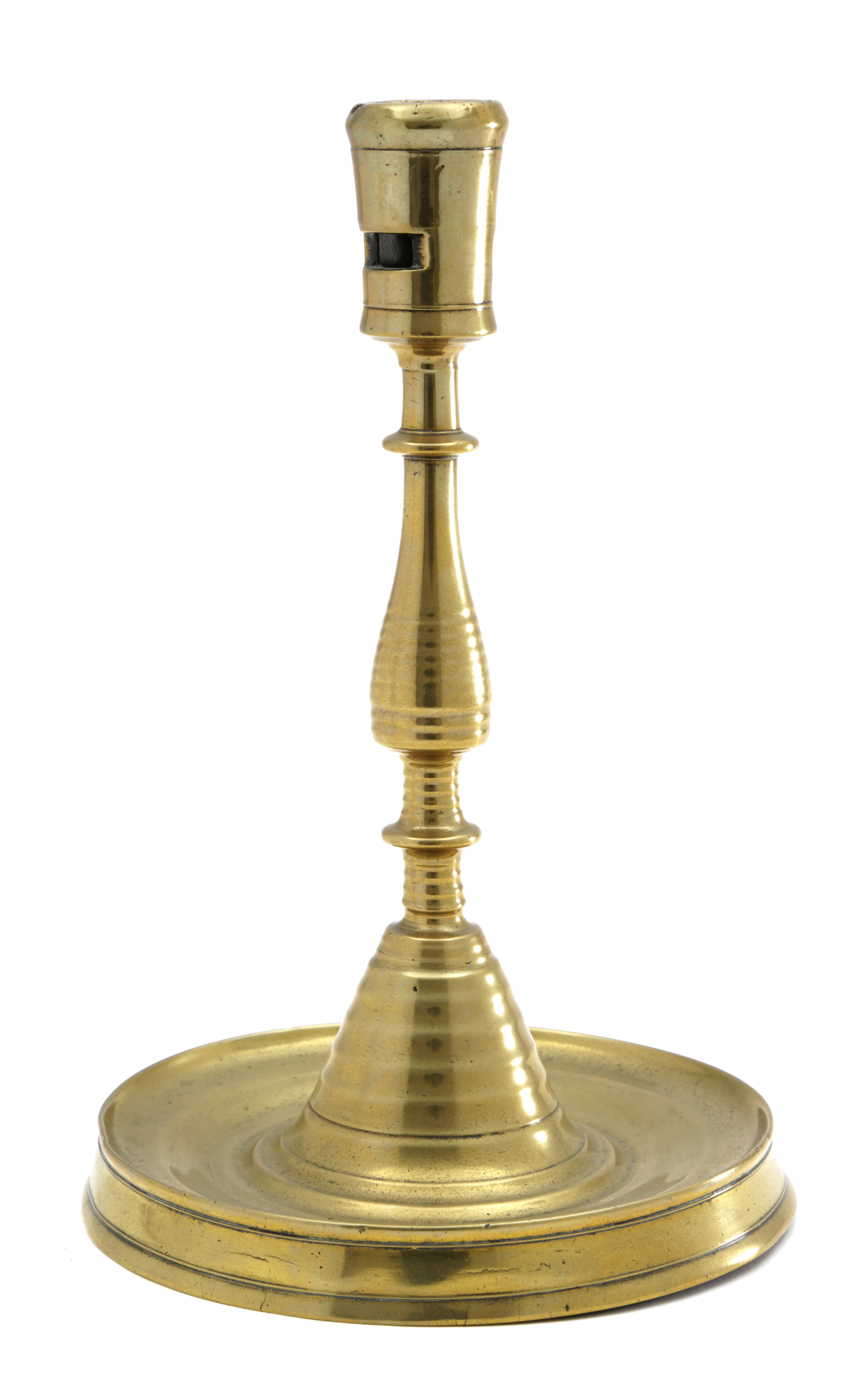 having a bold flared socket with paired rectangular extraction holes, atop a discoid knop and ribbed baluster stem, a ribbed high-domed base and dished base with splayed foot rim, with a precisely engraved ownership or merchant's mark to the underside