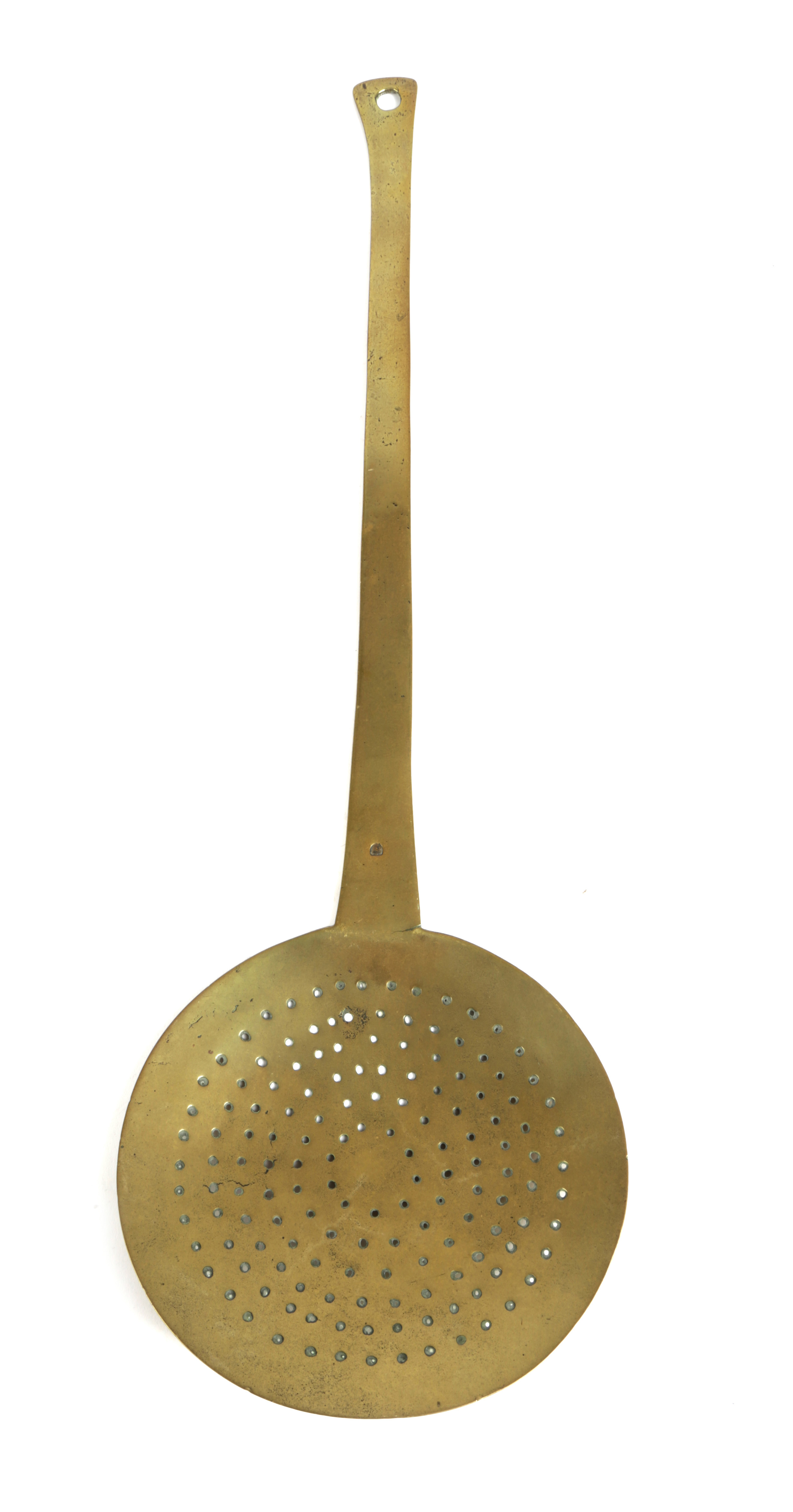 with six concentric rings of holes to near-flat pan, stamped maker's mark of 'RB' to front of handle, with splayed and pierced suspension hole terminal