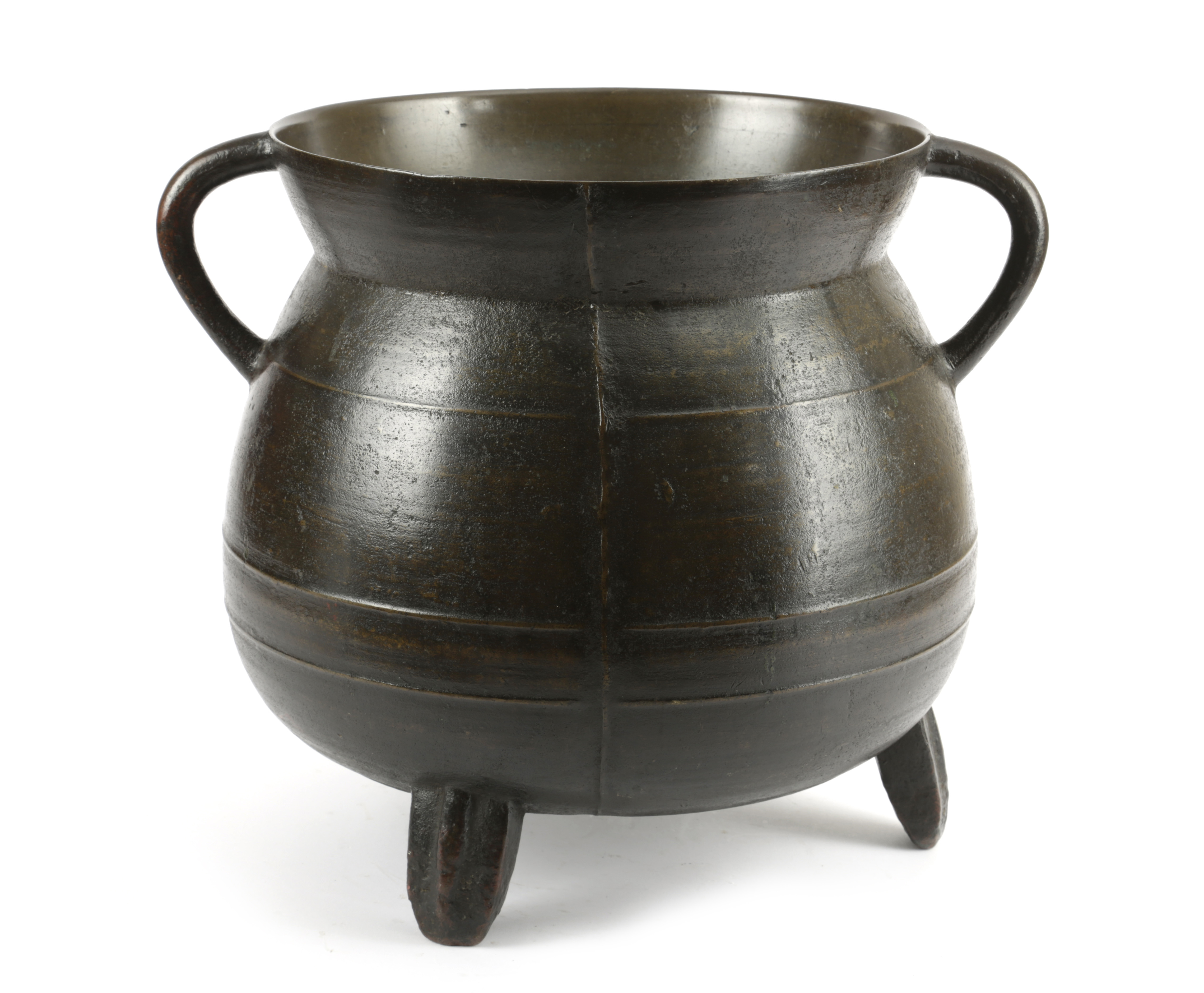five gallon, having an almost spherical body, with pronounced casting ridges and three wire mouldings (cords), curved handles, the legs with pronounced central ribs