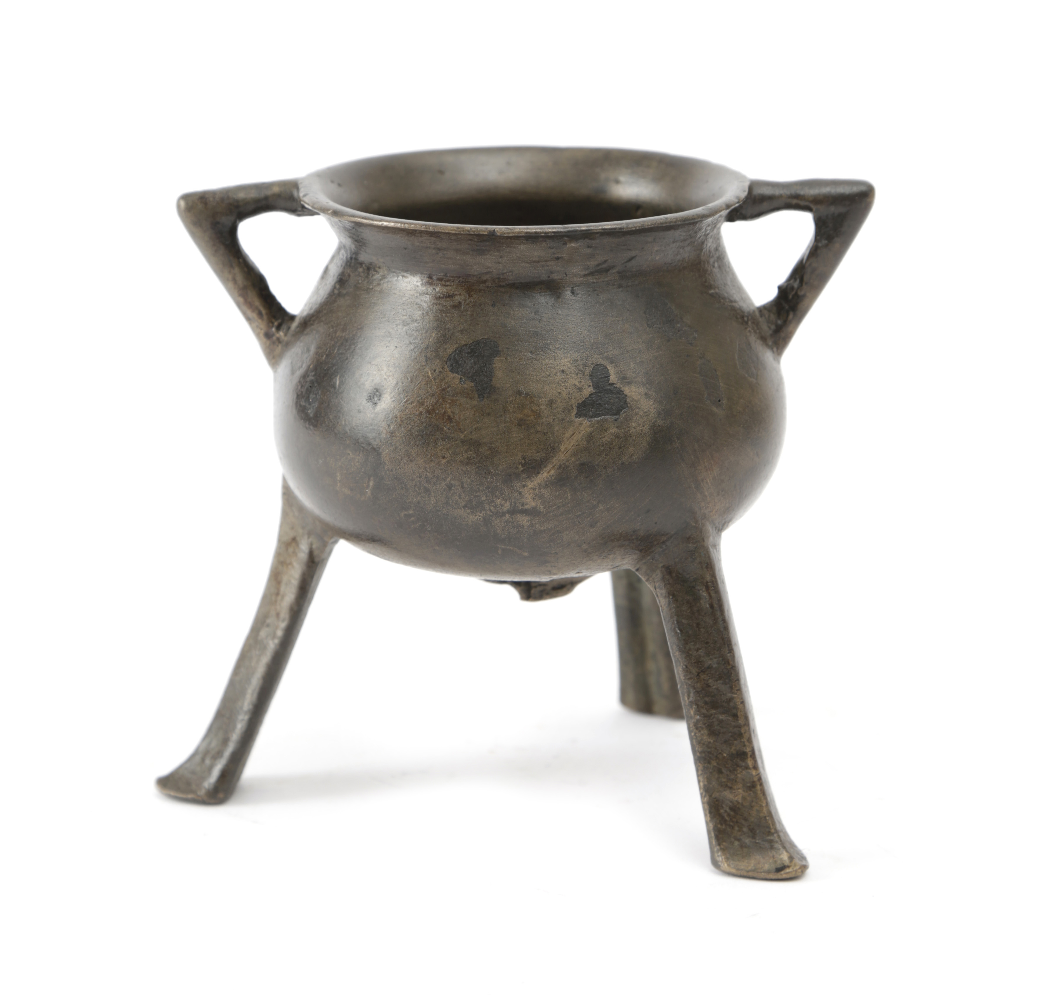 having an everted rim, aligned with horizontal angular lug handles, on full (unworn) triangular-section legs with rear relief rib and pointed feet, a pronounced and coarse sprue to underside and several chaplets randomly spaced and disproportionally large