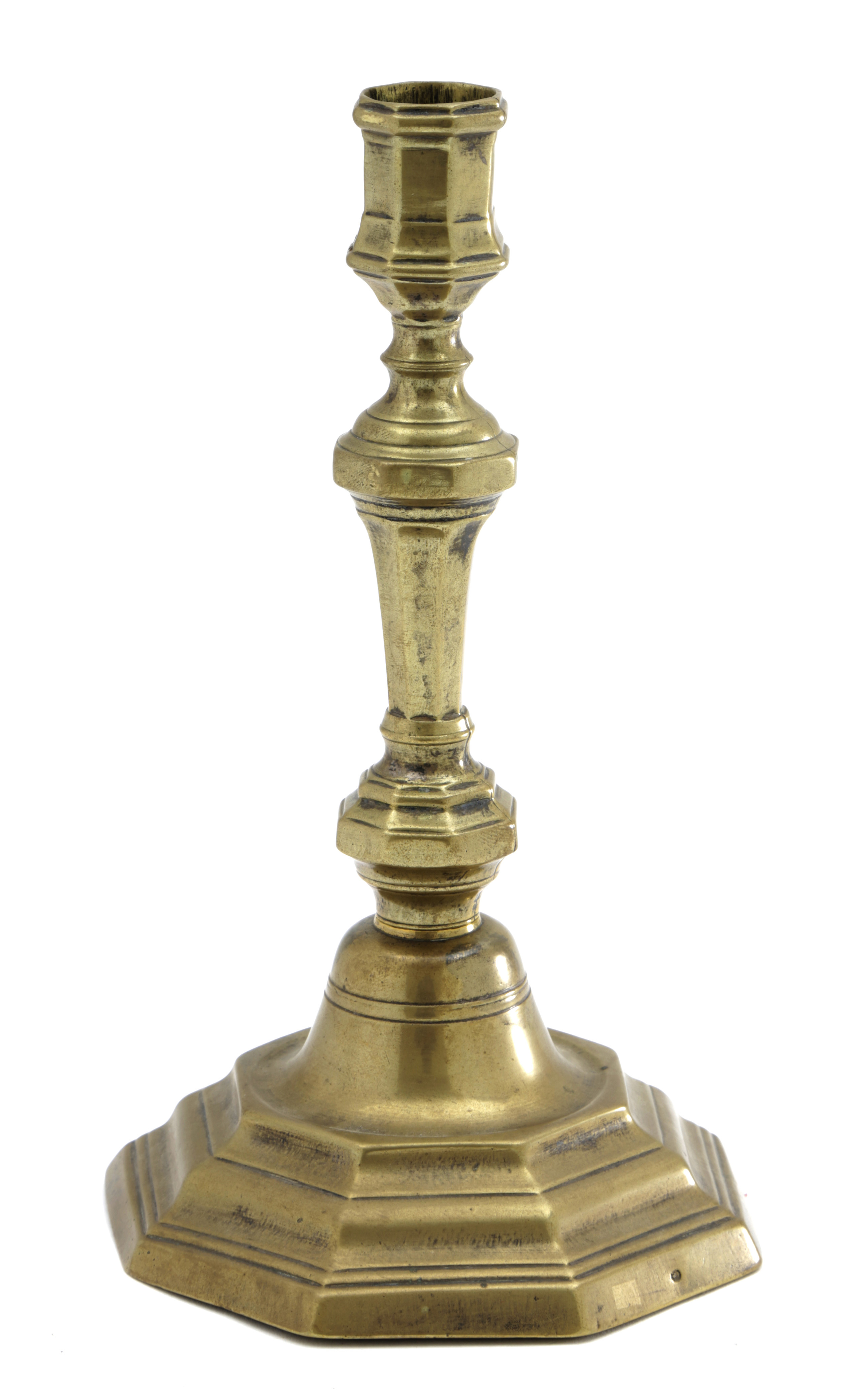 part seamed, two-part construction screwed together, the octagonal socket on a tapering octagonal stem between two knops, on a domed and stepped octagonal base, with remains of silvering, punched duty mark of a letter crowned 'C' to the foot rim and socket