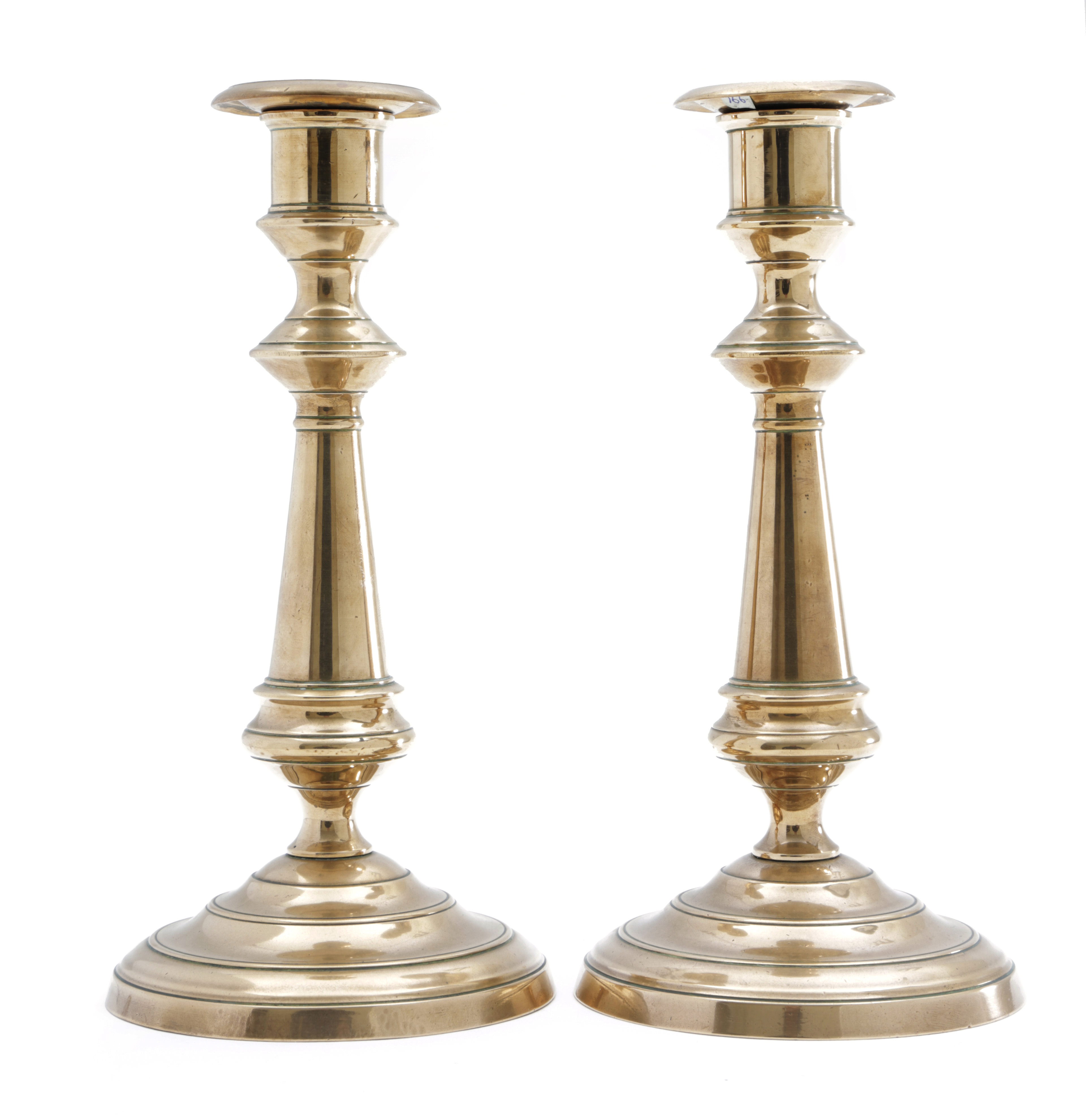 A PAIR OF MID-19TH CENTURY HIGH COPPER CONTENT BRASS CANDLESTICKS
