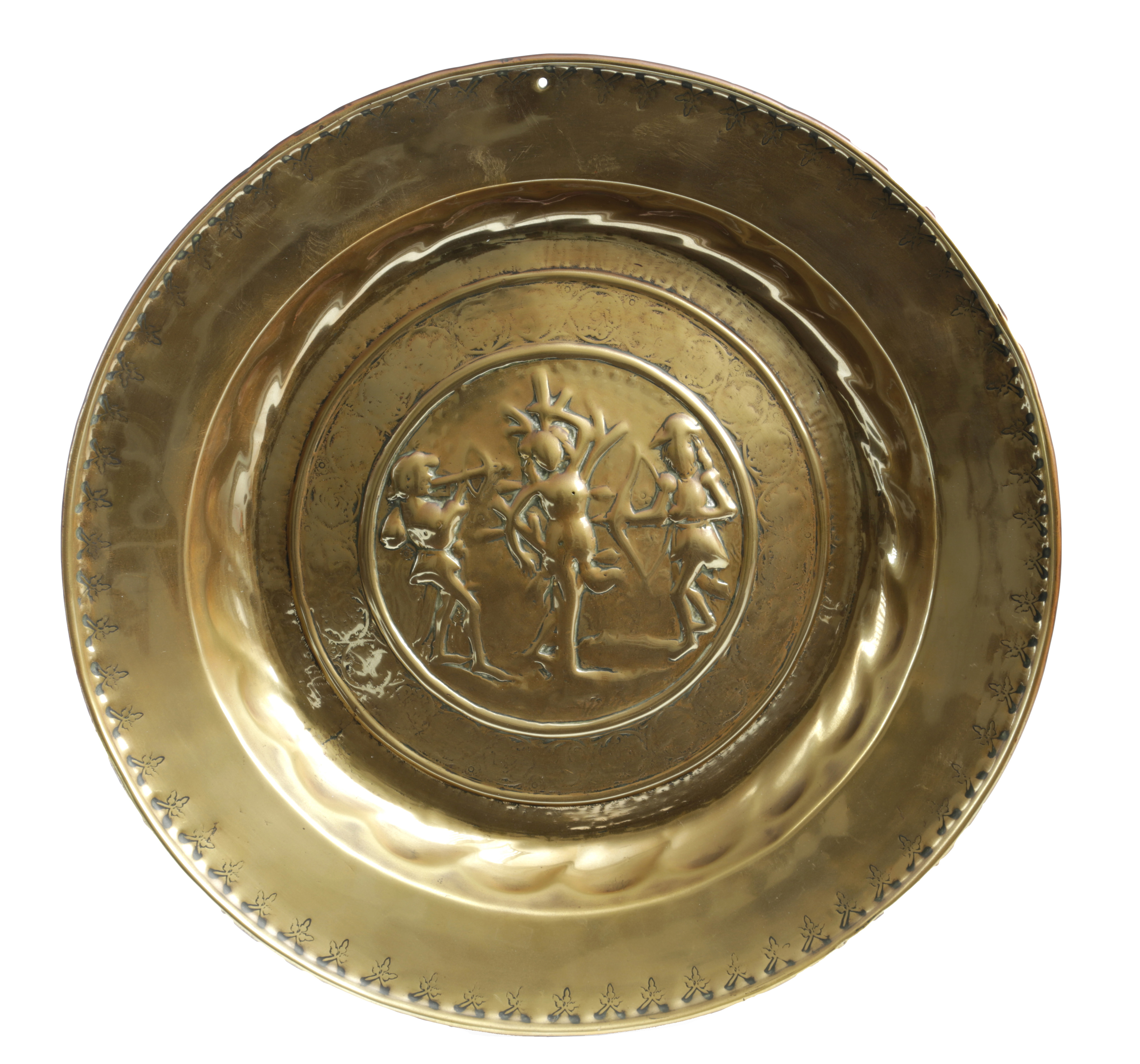 depicting St Sebastian to the centre, inside a band of foliate scroll decoration and 'Gothic' script, gadrooned booge, the rim with an acorn pendant border and folded rim