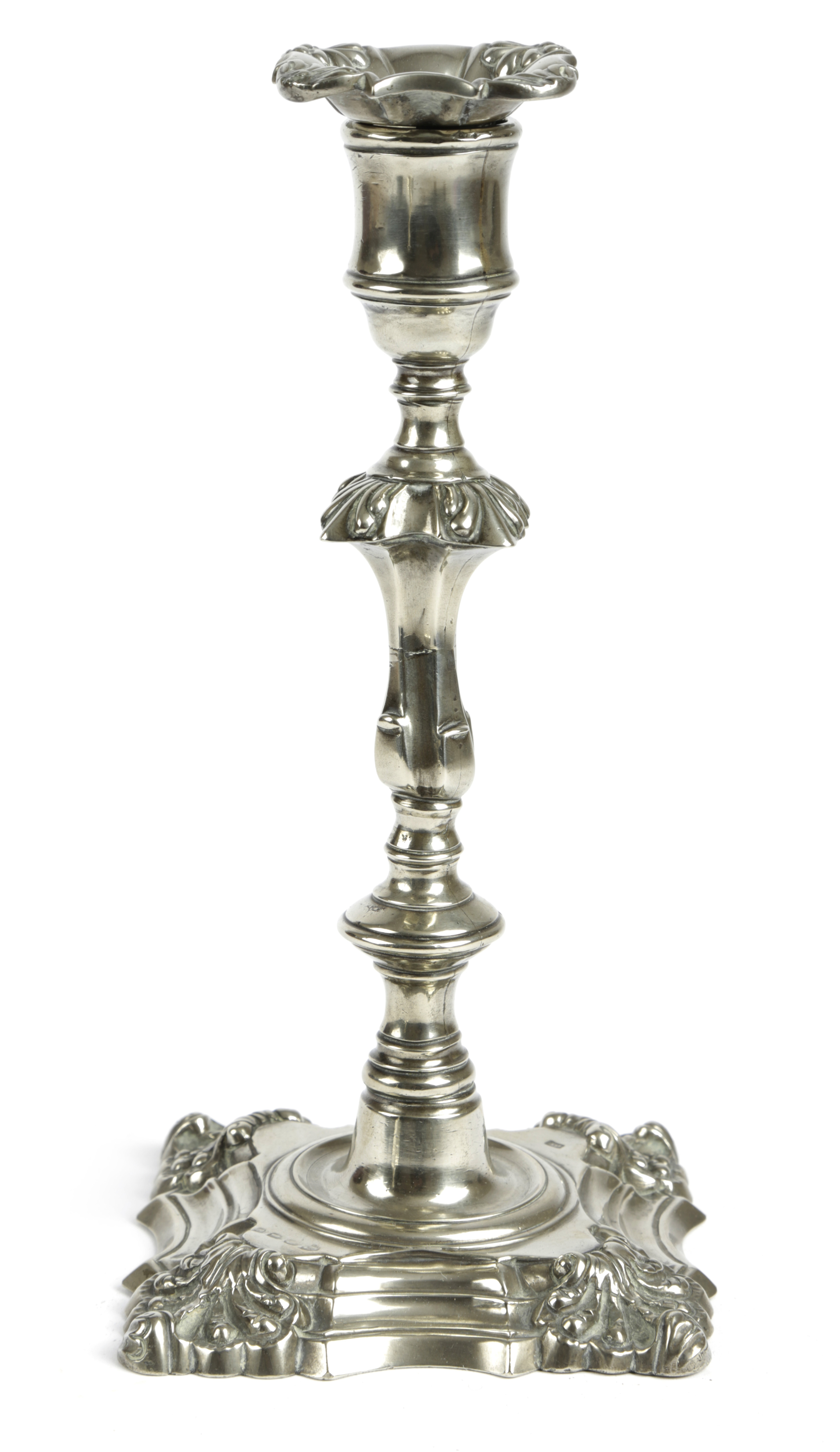 with leafy-shell decoration, a removeable sconce on a rising-baluster stem atop a discoid and shaped square base, the stem is seamed but fractured to centre either in making or later, however, this does not account for the asymmetry of the four lappets just below the fracture, with pseudo hallmarks