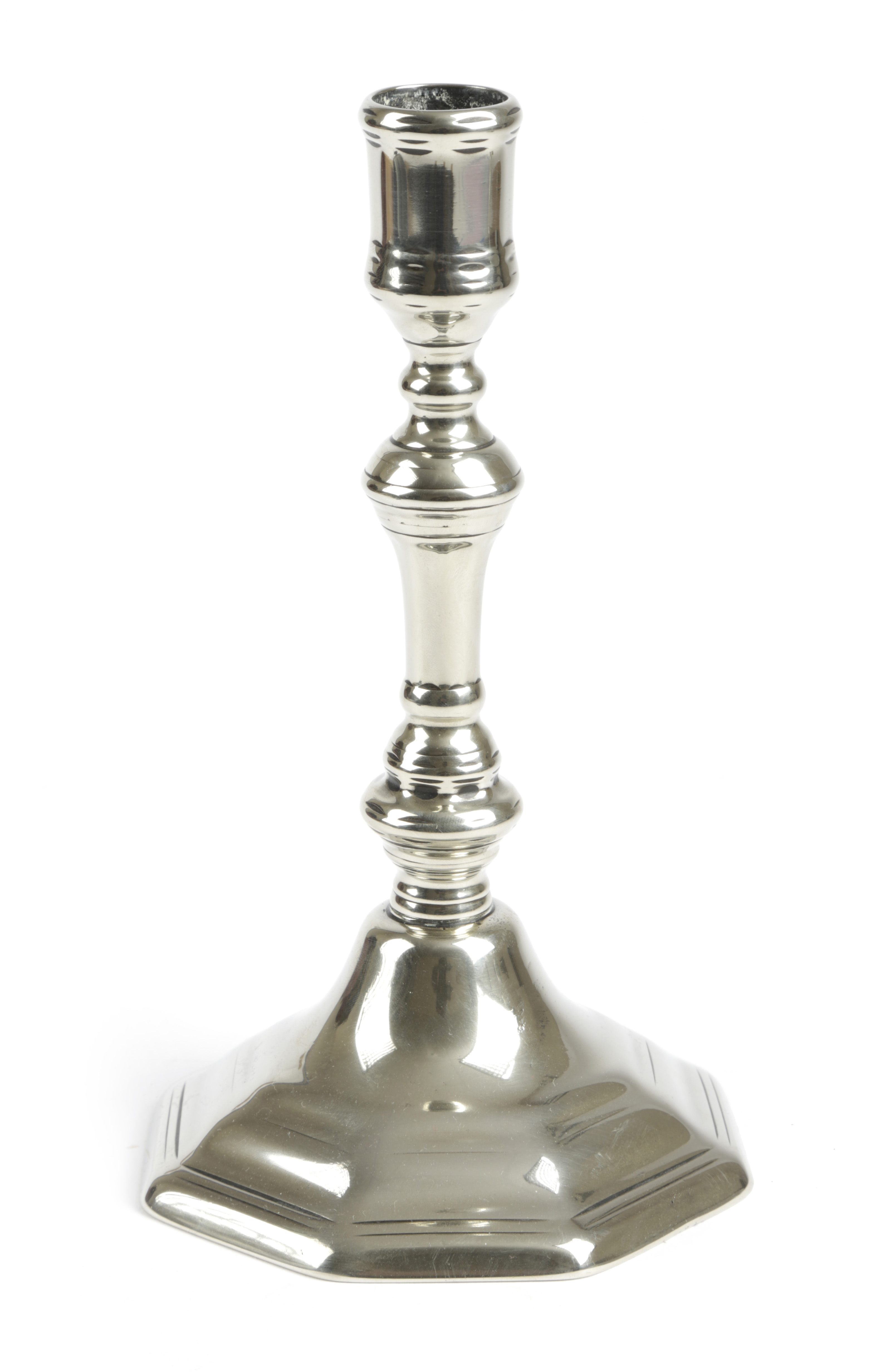 cast in two parts and threaded together, with a rising-baluster stem above a ball knop and faceted socket, on a raised octagonal base, a clear foundry patch to underside