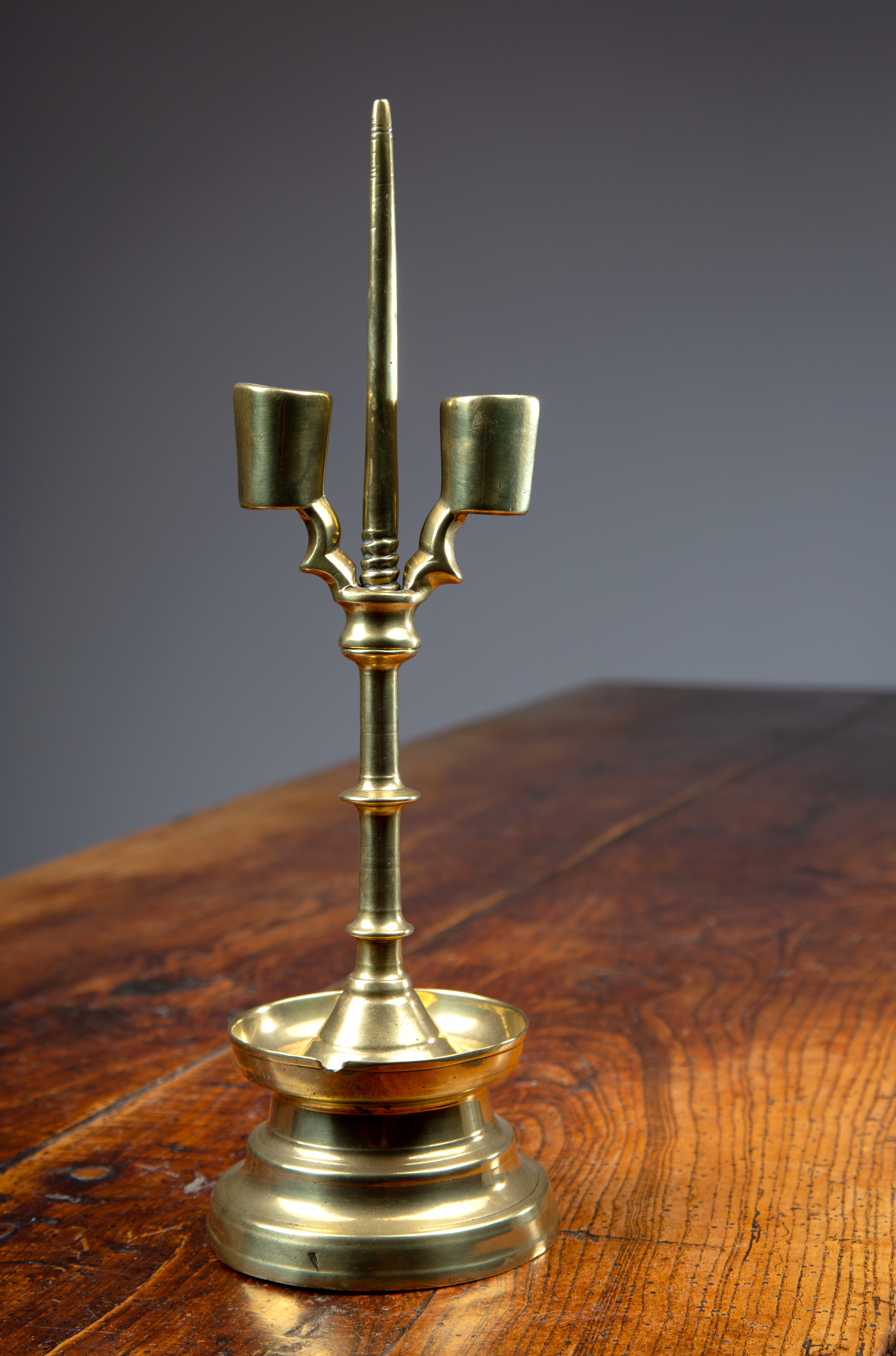 having a central pricket with detachable double-socket arm, the stem with two discoid knops, the two-stage base of a dish with a raised centre on a capstan foot