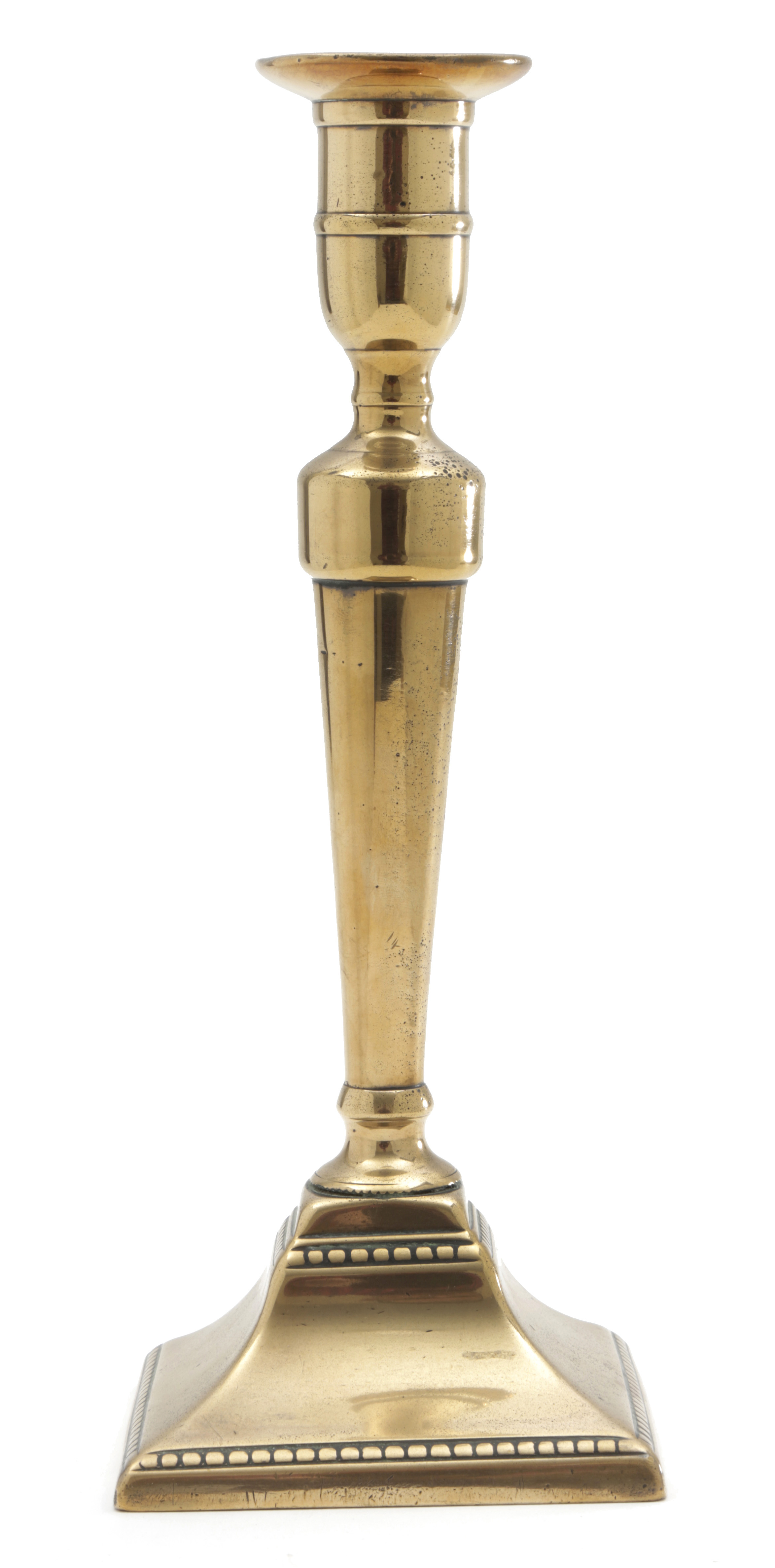 having an urn-shaped socket, tapering stem and concave square base with beaded edge, push ejector to underside and cast 'PATENT K'